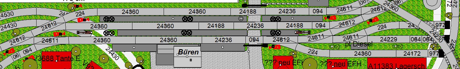 Die Stadt Büren besitzt einen Bahnhof an der Nebenstrecke von Paderborn nach Brilon-Wald. Hier zweigt auch die Strecke nach Geseke ab, die dort auf die Magistrale Hamm - Kassel trifft. Der Geseker Bereich ist auf meiner Anlage nicht mehr darstellbar. Um die Richtungsgleise (nach Brilon, Paderborn und Geseke) gegenüber den realen Verhältnissen besser zu verstehen, muss man sich den Plan um 180° gedreht vorstellen. Mein Anspruch war es nie, die Realität möglichst originalgetreu abzubilden!