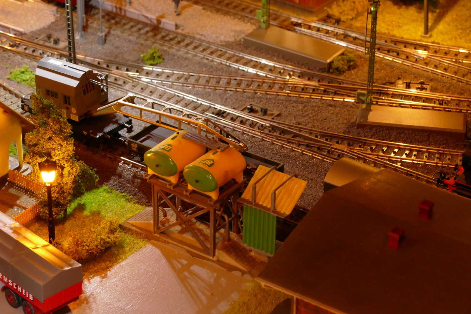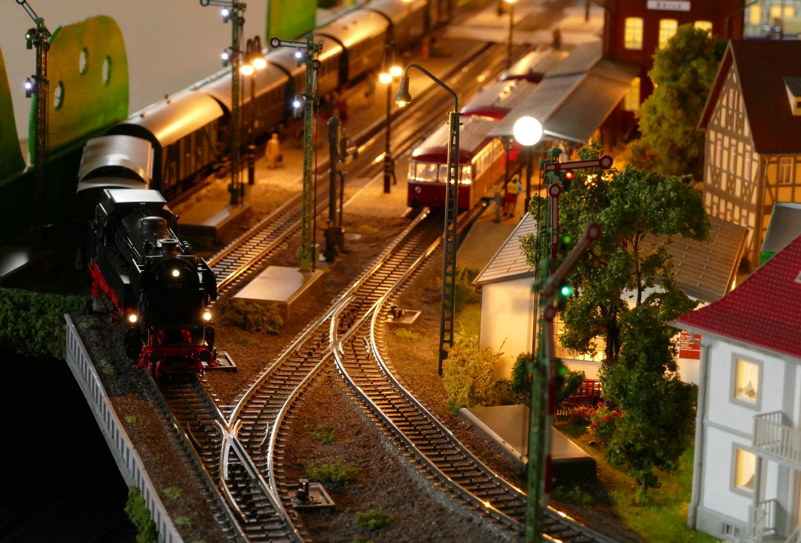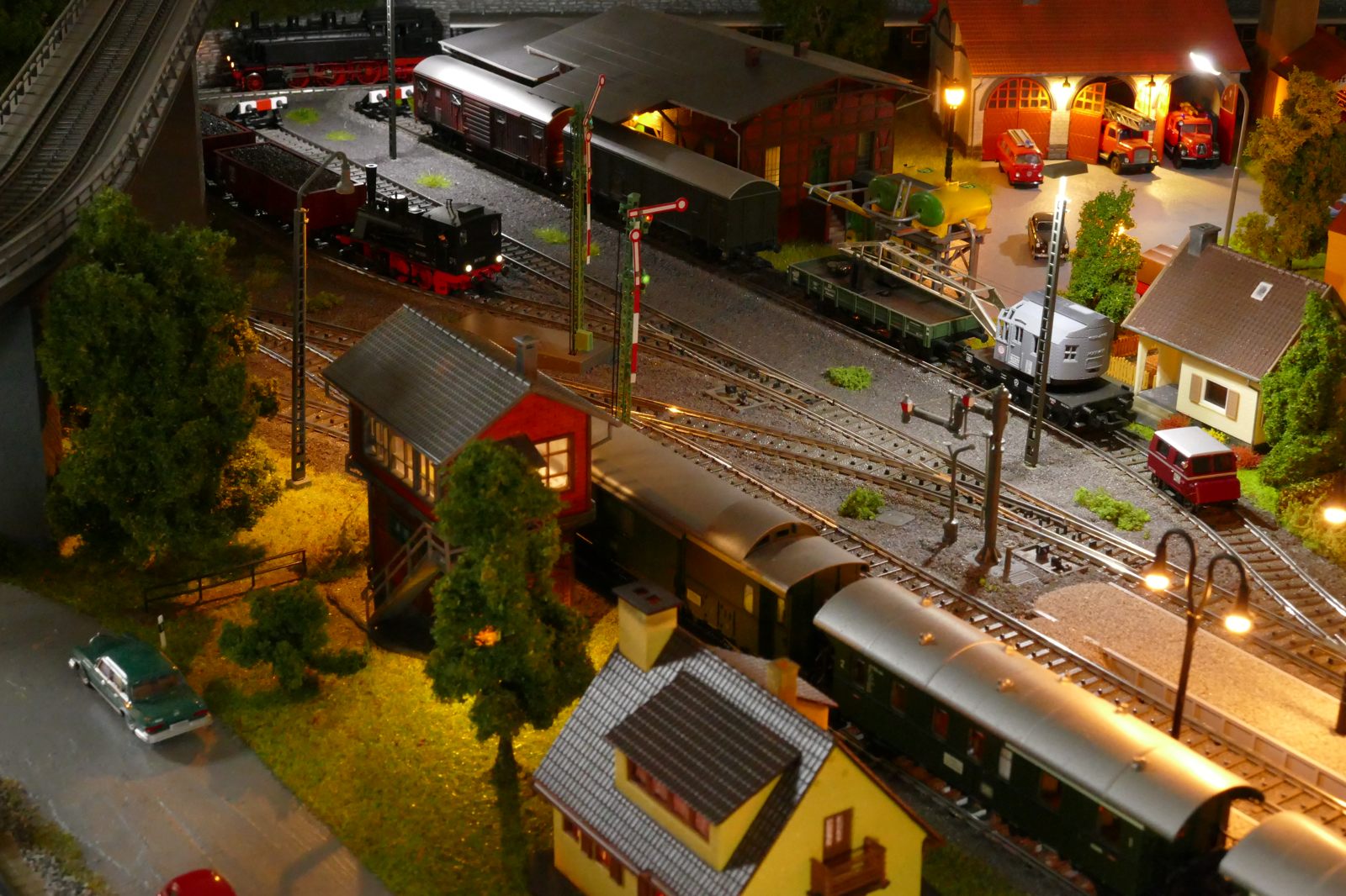 Ein anderer Tag, abends. Im Güterschuppen ist noch kein Feierabend, auch im Feuerwehrgerätehaus tut sich was. Die Stellwerkbesetzung freut sich, dass keine Langeweile aufkommt. Das Ausfahrtsignal für Gleis 1 und 2 zeigt freie Fahrt. Um diese Zeit kann es der Heckeneilzug nach Frankfurt nicht mehr sein.