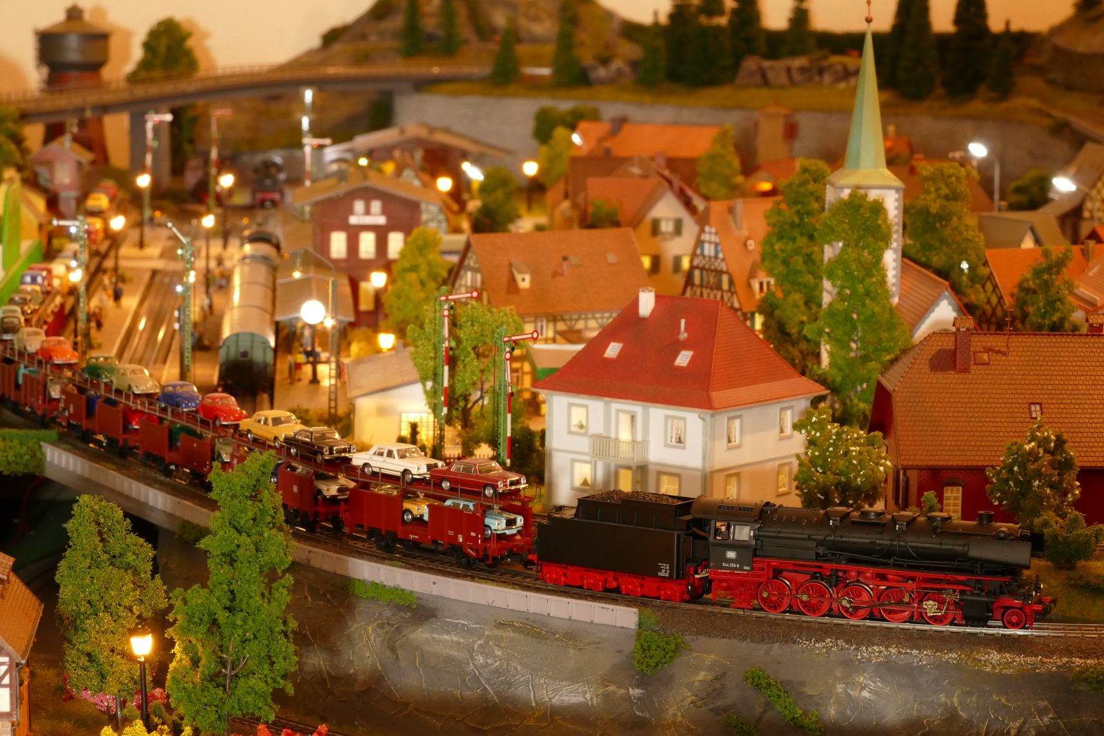 Mittlerweile verlassen die Fahrgäste den Schienenbus, der 3 Minuten Aufenthalt hat. Der Personenzug nach Paderborn hat sich gerade auf den Weg gemacht und rollt aus dem Bahnhof. Die 75 001 begeistert mit tollem Sound und sehr guten Fahreigenschaften. Sie kapituliert mit ihren fünf Zweiachsern vor keiner Steigung, ganz gleich ob sie schieben oder ziehen muss. In Bezug auf Zugkraft sind leider meine beiden Märklin 38er (38 1885 und 38 3812) ein absolutes Negativbeispiel. Ich hoffe auf eine baldige Neukonstruktion aus Göppingen mit ausreichend Zugkraft. Die jetzigen Modelle kann man in keiner Steigung mit einem Zug fahren lassen. Sie schleudern bei jeder Gelegenheit und bleiben "liegen". Die Haftreifenachse hat zu wenig Reibungslast.