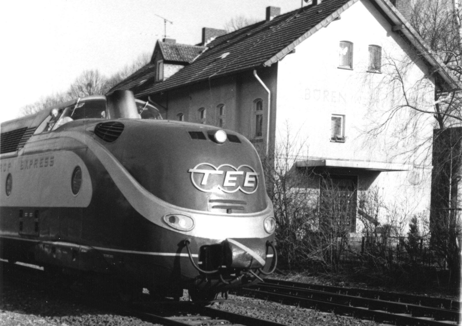 Gleisplanschema des Bahnhofs in Büren zur Zeit 1965/69; die Nordrichtung ist eingezeichnet (siehe Pfeil): So klein der Plan ist, so interessant ist er doch. Ich erkenne oben links beide Gleise zum Lokschuppen (Verlängerung von Gleis 7), darunter links vom Bahnhof (Richtung Südwest) das Abstellgleis vor der Verladerampe mit der Tankstelle (s. o.). Gleis 11 stellt die kleine Ladestraße vor dem Güterschuppen des Abfertigungsgebäudes dar. Von Gleis 7 geht ein Abzweig zum Kalk- und Zementwerk Burania. Im Nordosten zweigt das Anschlussgleis zur Fa. Kleeschulte ab, das bis in die 1990er Jahre noch für Getreidezüge benutzt wurde. Gleis 12 ist die Ladestraße, die u. a. von der Fa. Aust benutzt wurde, um Waggons mit Schrott zu be- und entladen. Etwa 1m unterhalb der Straße vor dem Bahnhof, also südlich des Lagerplatzes, ist das Kornhaus mit zwei Gleisen beidseitig angebunden. Parallel dazu verläuft (gestrichelt) ein Gleis, das vor dem Kornhaus an der Neubrückenstraße verlief. Von Abstellgleis 31 zweigt der Gleisanschluss der Fa. Ullrich ab, das ebenfalls für Getreidetransporte verwendet wurde. Auch die Fa. Spahn Möbel wurde mit diesem Gleis bedient. Angegebene Gleislängen in Meter. (BahnarchivNRW Slg. F. Weber)