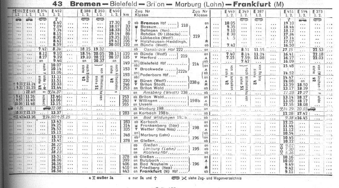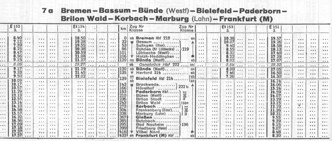 Der Heckeneilzug Frankfurt-Bremen wurde zu unterschiedlichen Zeiten mit unterschiedlichen Loks gefahren. Im Jahre 1958 habe ich diesen Lokplan gefunden: