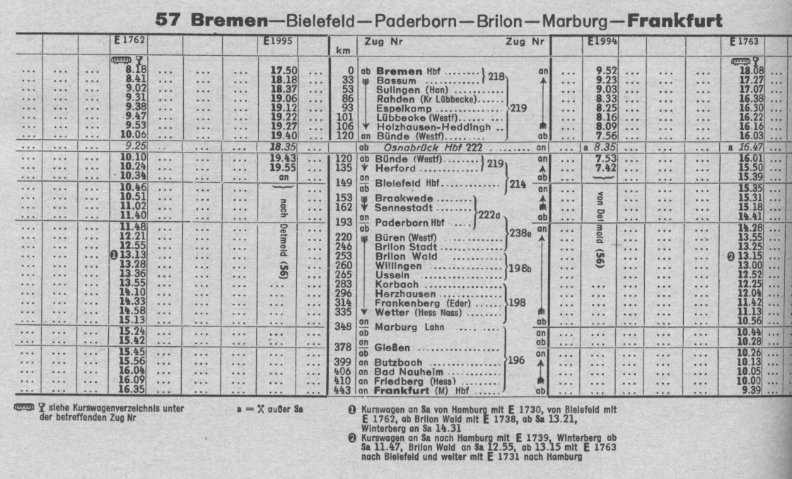 Damals führte der Heckeneilzug F – HB zwei Kurswagen auf der Main-Weser-Bahn mit sich, und zwar sowohl auf der Hin- wie auch der Rückfahrt. Der nordwärts fahrende Eilzug, der mit einer Lok der BR 141 bespannt war, führte zwei Kurswagen nach Kassel mit. Die Zugtrennung erfolgte in Marburg auf Gleis 8. Der Eilzug hatte bei der Ankunft in Marburg insgesamt acht Wagen (einschl. Gepäckwagen) dabei. Nach der Trennung fuhr der eigentliche Heckeneilzug mit einer Lok der BR 216 und sechs Wagen in Richtung Korbach – Paderborn – Bremen über die Nebenbahn. Nachmittags um 15 Uhr war es genau umgekehrt: Der N aus Kassel mit zwei Kurswagen setzte sich in Marburg vor den abgespannten Bremer Heckeneilzug und fuhr nach Frankfurt mit insgesamt acht Wagen weiter!