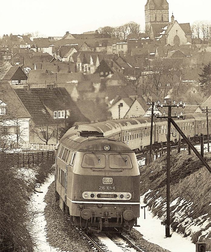 Sommer 1965. Ich bin 11 Jahre alt. Schulschluss, es ist kurz vor Mittag. Um 11.59 Uhr soll der Eilzug Bremen-Frankfurt in Büren einlaufen. Ich habe noch ein paar Minuten, dann kann ich ihn wunderbar sehen, wie er 350m von uns entfernt auf der Heide am VEW-Umspannwerk vorbeifährt. Unser Küchenfenster liegt im oberen Stock, die Aussicht ist prima. Ja, das Pfeifen der V100 ertönt am Bahnüberweg Menkenberg, da rollt er an mir vorbei. 6 lange Eilzugwagen schleppt die Diesellok hoch ins Sauerland. Eine kleine Weltreise. Um 7.29 Uhr ist der E452 in Bremen Hbf gestartet, um 16.37 Uhr wird er in Frankfurt Hbf einlaufen. Da kannst du gewissermaßen die Uhr nach stellen. Mehr als neun Stunden in den Wagen aushalten müssen? Nein, du darfst über neun Stunden in diesem tollen „Bummelzug“ über 443km mitfahren. Du wirst sogar bedient. Es kommt jemand mit einem Rollwagen durch die Gänge und verkauft dir Kaffee, Tee, Wasser, Limonade oder Süßigkeiten. Mit ca. 60km/h fährt der Zug von Bremen über Bassum, Sulingen, Rahden, Espelkamp, Lübbecke, Heddinghausen, Bünde, Herford, Bielefeld, Brackwede, Paderborn, Büren, Brilon, Willingen, Usseln, Korbach, Herzhausen, Frankenberg, Wetter, Sarnau, Marburg, Gießen, Butzbach, Bad Nauheim, Friedberg nach Frankfurt. Bedingt durch die vielen kurzen Aufenthalte und die zumindest früheren Lokwechsel sinkt die Reisegeschwindigkeit auf 48km/h an diesem Dienstag im Jahre 1965. Der Gegenzug benötigt sogar sieben Minuten länger; er startet um 9.29 Uhr in Frankfurt und läuft 18.48 Uhr in Bremen ein. Um 14.10 Uhr wird er hier in Büren Halt machen. D. h., ich sehe den Zug um 14.08 Uhr auf der Heide vorbeirauschen! Hinter der Diesellok laufen heute ein Postwagen, ein Gepäckwagen und vier silberne Eilzugwagen. Wie gern würde ich dort sitzen und mitfahren. Nur, zeit meines Lebens war ich nie Fahrgast in meinem schönen Heckeneilzug. So habe ich ihn auf meiner Anlage nachgestellt; ‚mal läuft er mit ’ner V100, ‚mal mit ’ner 50er Dampflok in Büren ein. Mal ehrlich, wenn die Lokpfeife der Roco-Lok ertönt, bilde ich mir jetzt noch ein: genauso schmetterte eine 50er vor dem Heckeneilzug und speziell vor Güterzügen in den 1960er Jahren den Ton heraus. In der Dämmerung oder im Dunkeln an Wintertagen konnte einem kleinen Knirps Angst und Bange werden, wenn die Lok neben dir vorbeidonnerte und die Lokpfeife dich erschauern ließ.