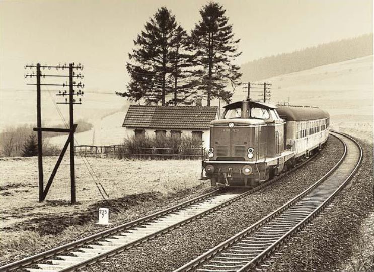 Das erste Eilzugpaar von Bremen nach Frankfurt und umgekehrt startete mit dem Sommerfahrplan im Mai 1949. Es trug den Namen E151/E152. Für unsere Region von Brilon bis Paderborn war es ein Fortschritt, konnte man doch nun direkt zu den Eisenbahnknotenpunkten im Norden und Süden gelangen. Anfangs wurden auf dem Nordabschnitt Bremen bis Paderborn fast ausschließlich Loks der Baureihe 38 eingesetzt, zwischendurch angelöst durch die BR23, später ersetzt durch die BR03. Im bergigen Mittelabschnitt der 443km langen Strecke wurden die Dampoflokomotiven der BR50 verwendet. Auf dem Südabschnitt Marburg – Frankfurt (Main) gab es wieder diverse Baureihen, die als Zuglok dienten: BR23, BR39, BR01. Ab 1953 lief das Eilzugpaar unter der Nummer E4151/452, die zum Ende noch einmal geändert wurden (E852/E853 und E1762/E1763 ab 1969/1970). Nach dem Aus der Dampflokomotiven als Zuglok für den Heckeneilzug im Jahre 1965 wurden Dieselloks der BR V100.20 mit einem 1350PS Motor eingesetzt. An Wochenenden und Feiertagen hatte der Zug ein höheres Gewicht. In diesen Fällen fuhr die DB mit V100.20 in Doppeltraktion, um die Fahrzeiten einhalten zu können. Später erstzte man die V100.20 durch die 1900PS starke BR216. Nun konnte auch die Doppeltraktion entfallen.