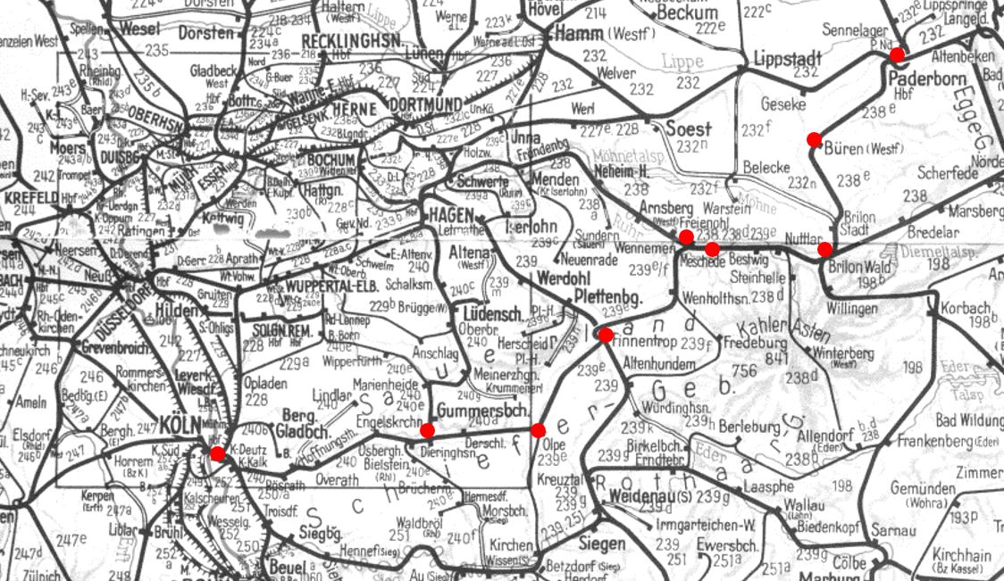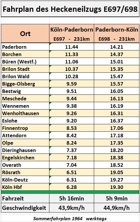 Von Mai 1963 bis Mai 1965 fuhr zwischen den beiden Bischofsstädten Paderborn und Köln ein Eilzugpaar, der E697/698, über die Almetalbahn. Die Züge waren mit Diesellokomotiven der Baureihe V100.10 bespannt und i. d. R. mit drei Eilzugwagen vom Typ „Silberling“ unterwegs. Wegen der Bischofsstädte als Start- und Zielort sprach man auch vom „Kardinalsexpress“. Der Zuglauf führte durch das Sauerland (siehe Karte) und wurde wegen fehlender Nachfrage nach zwei Jahren wieder eingestellt. Fahrpläne lagen mir leider nur unvollständig vor. Dank des Teams von der Miniaturwelt Eslohe (Kaspar!) ist der Sommerfahrplan nun vollständig. Heute sind Teile der alten Strecke stillgelegt oder als Radweg ausgebaut. Eine Radtour auf dem Sauerland Radring Nordschleife lässt die alte Streckenführung tw. erkennen bzw. erahnen. Einzelne historische Wandtafeln geben interessante Hinweise zur ehemaligen Bahn dort.