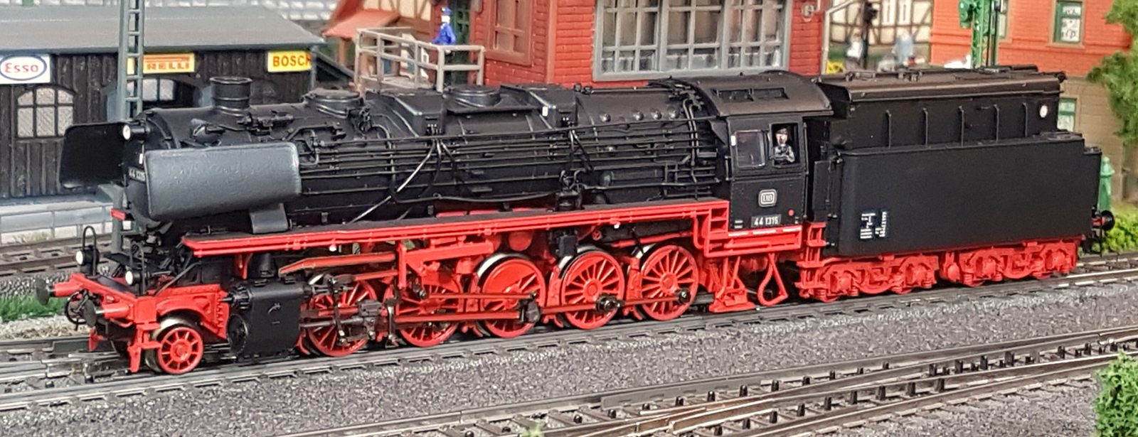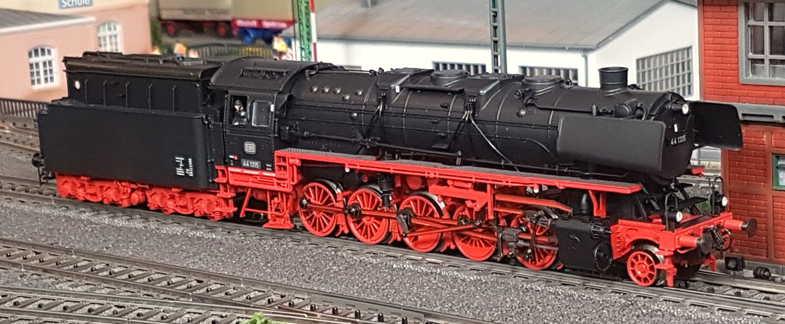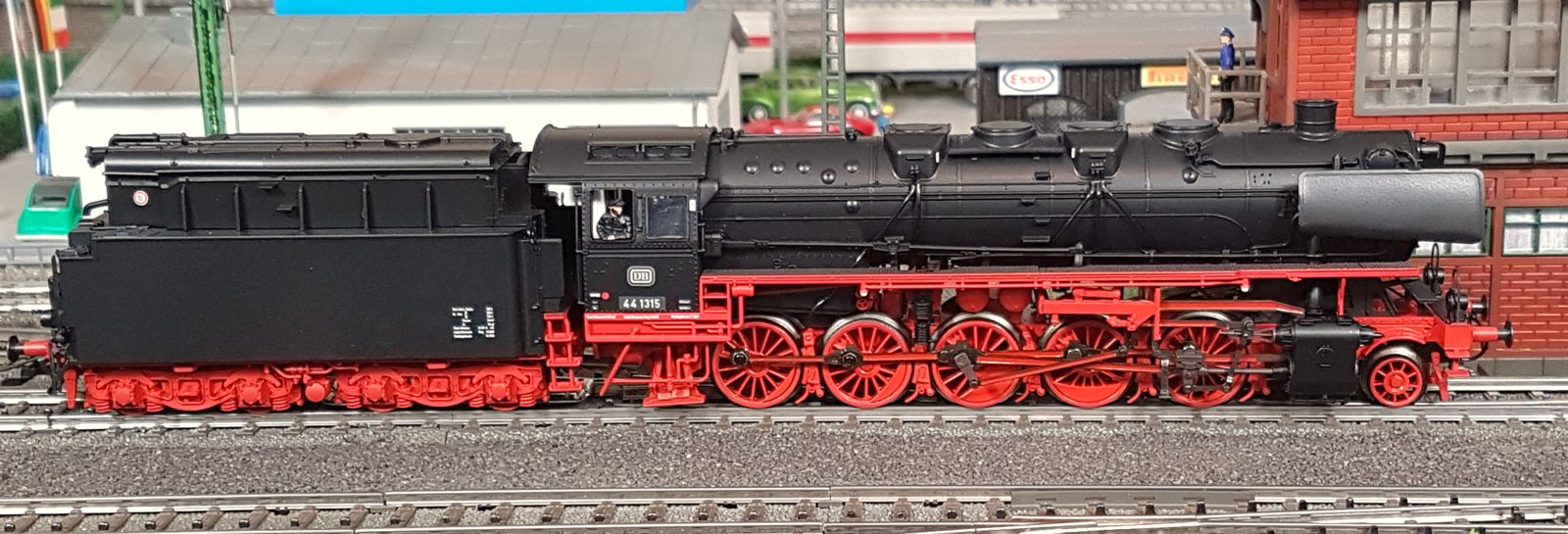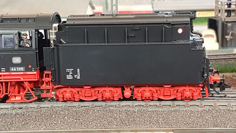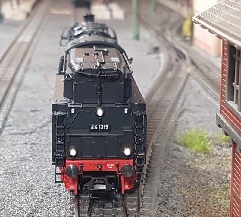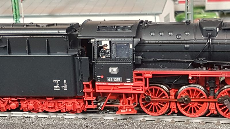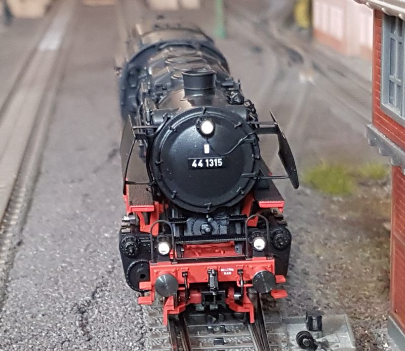 Das Märklin-Modell der BR44 1315 gehört zu meinen liebsten Loks. Sie ist fein detailliert und eine maßstabsgetreue Nachbildung des Vorbilds. Man muss, wenn man sie in den Händen hält, nicht gleich Angst haben, dass etwas abfällt. Die hinteren Bremsschläuche musste ich leicht einkleben, da die Bohrungen etwas groß geraten sind. Der Lok-Tender-Abstand ist bei mir auf eng gestellt. Damit fährt sie durch alle Kurven (ich habe keine R1-Radien (360mm) auf meiner Anlage. Das Lokpersonal habe ich von Roco nachgerüstet (Art.Nr. 40001). Natürlich fahre ich die Lok ohne Kupplung vorn. Radkränze, Gestänge, Anbauten, mir gefällt die Lok sehr gut. Märklin hat sich in jeder Hinsicht in den letzten Jahren überall verbessert. Klasse. Die Fahreigenschaften sind hervorragend. Sehr weiches Anfahren (v(min) = 0,7km/h), sanftes Beschleunigen und schönes Abbremsen untermalt mit realistischem Sound (habe extra mir das Original nochmal angehört!) lassen die Lok glänzen. Hinzu kommt eine starke Zugkraft und eine tolle Ausstattung mit 24 Funktionen. Der Tender ist gegenüber älteren 44er-Modellen (zum Bsp. meine 44 100 Öl) deutlich schwerer. Damit ist die Gefahr von Entgleisungen bei Rückwärtsfahrt mit 20 oder mehr Wagen sehr gering.