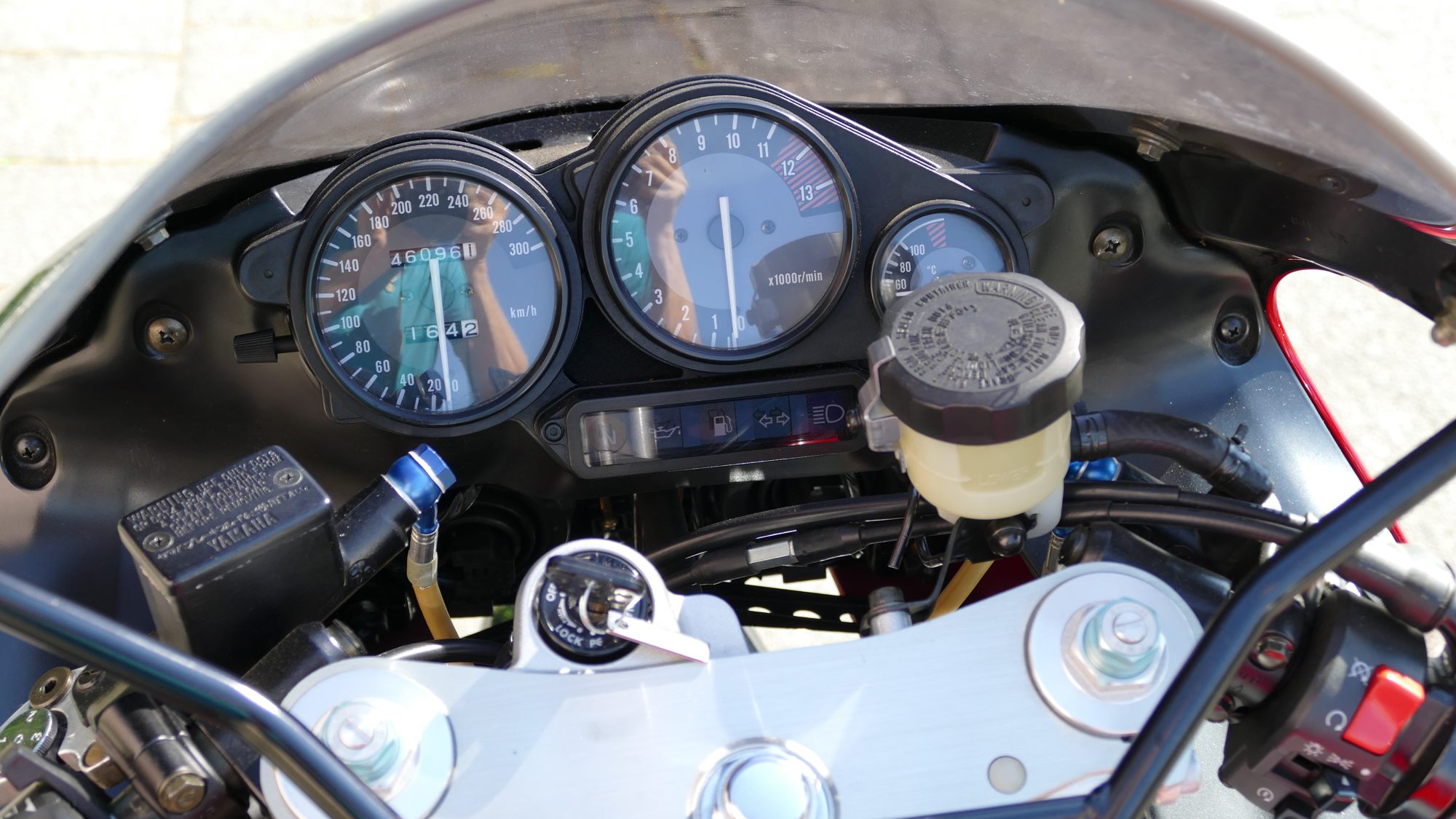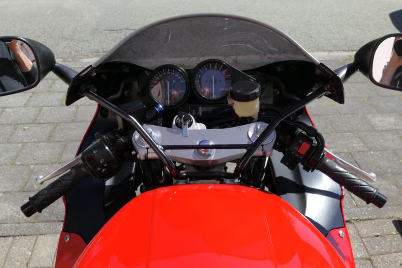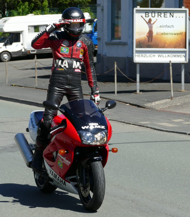An meiner, individualisierten Maschine wurden verbaut: ein flacherer LSL-Lenker, Kellermann-LED-Blinker, eine Akrapovic-Endschalldämpfer für mehr Drehmoment und Sound, Wilbers-Gabelfedern mit entsprechendem Gabelöl für ein feineres Ansprechen und bessere Dämpfung speziell beim harten Anbremsen. All die Änderungen bringen im Resultat ein deutlich besser liegendes Motorrad, dass auch noch schöner ausschaut und cooler klingt, ohne laut und aufdringlich auf die Umwelt zu wirken. Höchster Gang in Ortschaften ist sowieso oft die einfachste Art, unser Image „laut und krawallig plus Raser“ positiv zu verändern. Ich selbst mag die Spinner mit ihren lauten, offenen Anlagen, die in kleinen Gängen fahren und auch gerne mal extra zurückschalten oder die Harley-Proleten mit den bollernden Krachtüten überhaupt nicht. „Sei freundlich zu deinen Mitmenschen, dann sind sie es auch zu dir.“ Die Einstellung geht zu vielen von uns Motorradfahrern leider ab. Das ist auch nicht unbedingt eine Frage des Alters. Ok, zurück zur RP19. Nach den Serien-Dunlops habe ich auf Pirelli Angel GT gewechselt, danach auf Michelin Pilot Power. Ich war mit allen zufrieden. Dunlop war ist Erstbereifung, die Pirellis sind im Regen klasse, auch im trockenen sehr sportlich zu fahren. Pilot Power auf ’ner XJR ist halt meine Philosophie. Super Haftung trocken und nass und sehr preiswert. Was will ich mehr. Die Bemsanlage spricht fein an und packt kräftig zu, wenn man selbst kräftig zupackt. Kein ABS. Wenn der Reifen jault, ist die Haftgrenze erreicht. In Kurven mit weniger Haftung rutscht die Maschine mit den Pirellis oder auch den Michelin meist über beide Räder weg; man kann es abfangen ohne Herzrasen zu bekommen. Genau das Gefühl kann man sich schnell holen, wenn man in größerer Schräglage auf die weißen Fahrbahnmarkierungen in der Mitte gerät. Ein leichtes Rutschen oder seitliches Versetzen und weiter geht es. Dies gilt natürlich für jedes Zweirad und nicht speziell für die Yamaha. Aber nicht für jeden Reifen! Die Maschine besitzt einen Seiten- und einen Hauptständer. Für Reifenwechsel besitze ich Montageständer für hinten und vorne. Das Getriebe lässt sich sehr gut und weich schalten, Zwischengasstöße sind gut kontrollierbar beim Bremsen. Die Dicke wiegt rund 5 Zentner, ist aber etwa 2-3kg leichter als das Serienmotorrad wegen Auspuff und Blinker. 110PS schieben die Maschine in gut 3s auf 100km/h und bis max. 220km/h flach liegend.