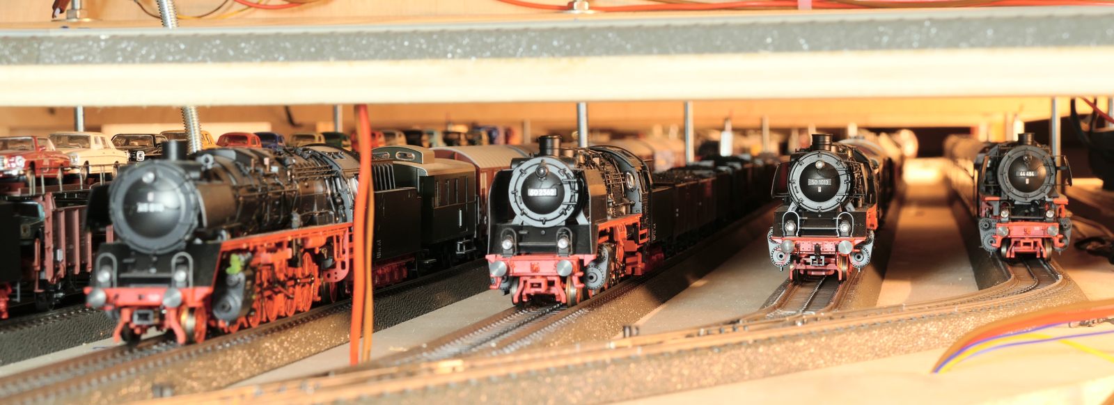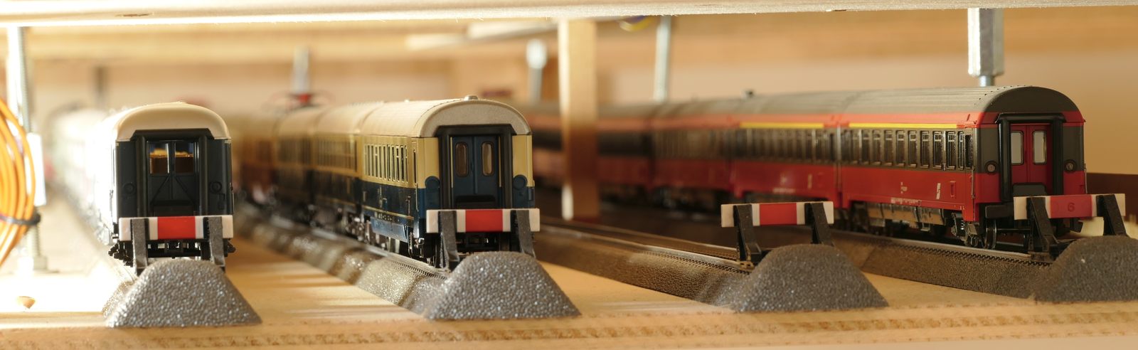 Im Folgenden stelle ich meine Schattenbahnhofsbereiche im Gegenuhrzeigersinn vor. D. h., ich beginne bei SchBf3, gehe zu SchBf2, SchBf1 und ende bei SchBf4. Die Enge unter der Anlage in Verbindung mit Stativ und Lichtverhältnissen bargen so einige Schwierigkeiten bei den Fotoaufnahmen. Es ging oft nicht ohne schlangenartige Verbiegungen, um noch den Kameraausschnitt sehen zu können. Wie schon gesagt, der vierte, neue SchBf ist in Planung und noch nicht existent, nimmt aber langsam Formen an. (Stand: 26.02.2020)
