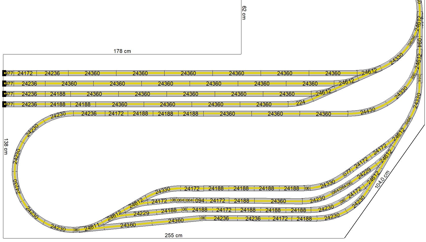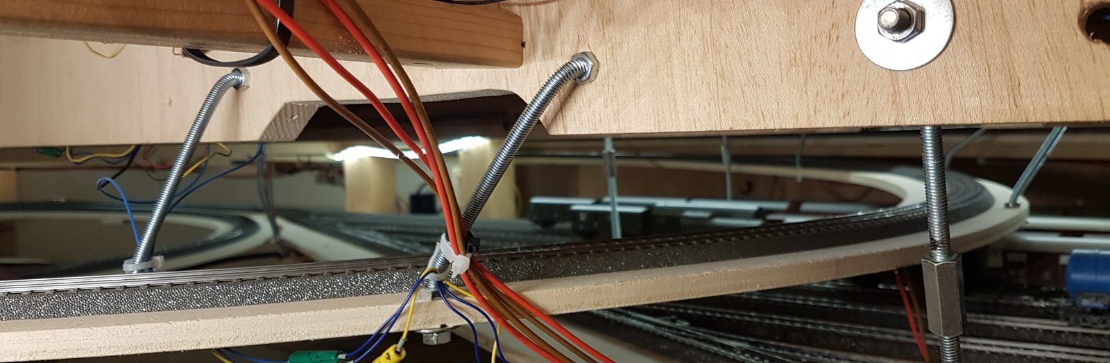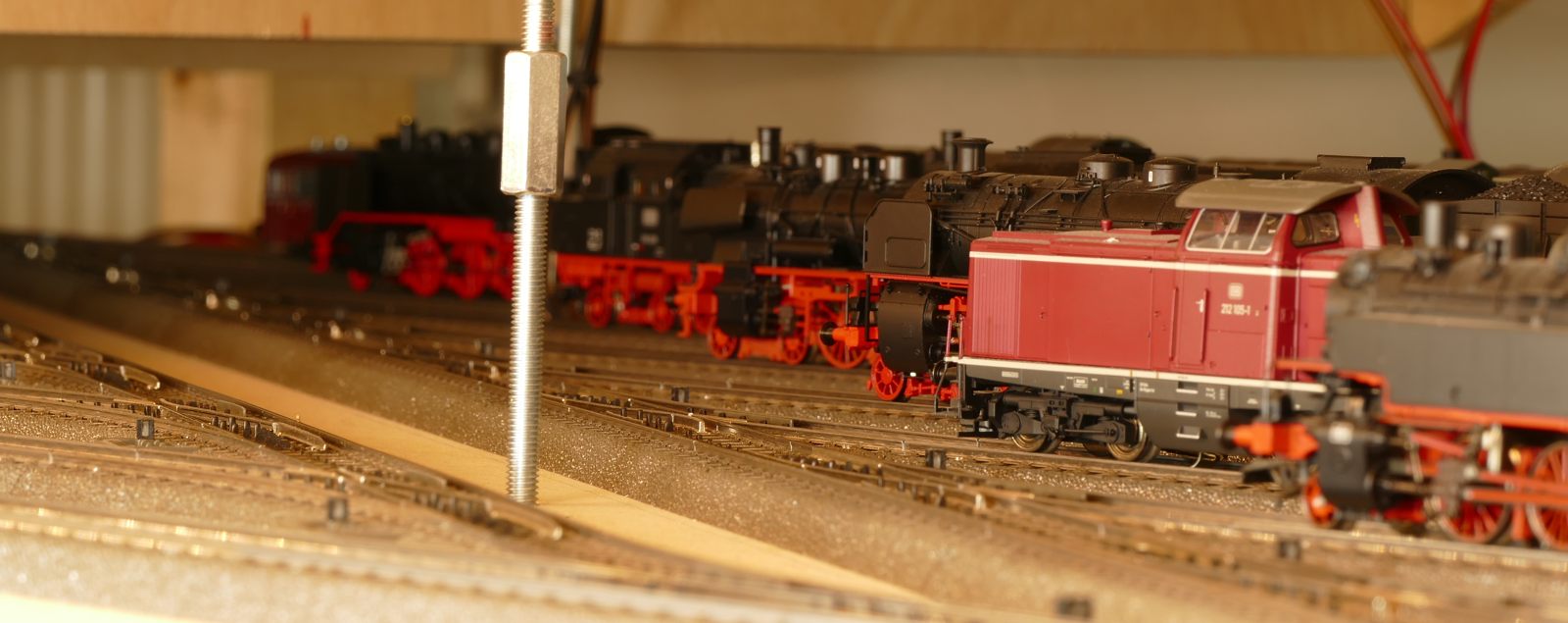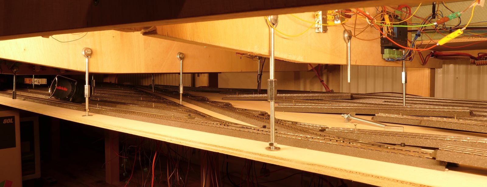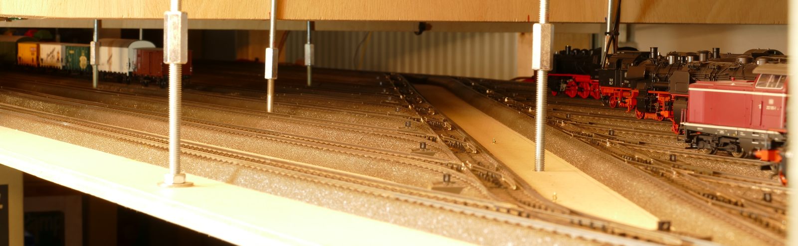 Mein neuestes Projekt. Diese Idee ist aus diesem Jahr 2020, die Umsetzung wird in den ersten Monaten 2020 erfolgen. Nach der Fertigstellung meiner Modellbahnanlage fehlte mir etwas; also kam mir die Idee, unter der Anlage zu erweitern. Oben habe ich keinen Platz mehr für Erweiterungen. Ein weiterer Schattenbahnhof macht Sinn, da ich hier Wagenmaterial bzw. kürzere Züge parken kann. Die Ein- und Ausfahrt erfolgt als Abzweig von der bisherigen langen Ein- und Ausfahrt des Schattenbahnhofs. Es gelang mir, die Höhe der anderen drei Schattenbahnhöfe auch hier einzuhalten. Dazu habe ich schon kleinere Anpassungen an der alten Zufahrt und an dem Unterbau vorgenommen, sodass die neue Zufahrt hineinpasst. Zwischen den vier Durchgangsgleisen und den vier Abstellgleisen (unten im Bild) im SchBf4 ist eine großzügige Öffnung vorgesehen. Auch diesen SchBf werde ich an Gewindestangen M6 aufhängen. Das erste Gleis dient tatsächlich als Durchgangsgleis, die Gleise 2-4 sowie die sechs Abstellgleise nutze ich für kürzere Züge (RAm TEE, VT95, 2xVT98, VT75 u. ä.). Im Januar 2020 habe ich – wie schon im Menüpunkt Entwicklung erwähnt – die erste beiden Schattenbahnhöfe umgebaut; der sehr lange SchBf1 wurde um eine Gleislänge, also 360mm, gekürzt, der andere SchBf2 um die gleiche Strecke verlängert inkl. Umbau von 20 Weichen. Diese Arbeiten sind abgeschlossen. Den neuen SchBf4 habe ich noch einige Male geändert, um viele meiner alten, bisher übrigen C-Gleise möglichst mit zu verwenden. Jetzt, am 26.02.2020, steht der endgültige Ausbauplan für diesen SchBf4. Die zwei neuen, aber sofort defekten Weichenantriebe Märklin 74492 wurde ausgebaut und durch Überbrückung der Mikroendschalter wieder in Stand gesetzt. Übrigens besitzen diese gegenüber der Art.Nr. 74491 nun ca. 1,5m lange, steckbare Anschlusskabel. Zumindest dies ist positiv. Warum sie die Antriebe für Digitalbahner nicht ohne die extrem anfälligen Endschalter anbieten, weiß nur Märklin selbst. Ich kann nur jedem Besitzer einer größeren Märklin-Anlage raten, die Endschalter von vorneherein „lahmzulegen“. Ich werde noch viel Ärger bekommen, wenn die Weichenantriebe nach und nach mittig in fest verschotterten Gleisbetten ausfallen. Ein Ausschneiden im Brett unter der Weiche macht bei zwei, drei oder mehrstöckigen Anlagen auch keinen Sinn.