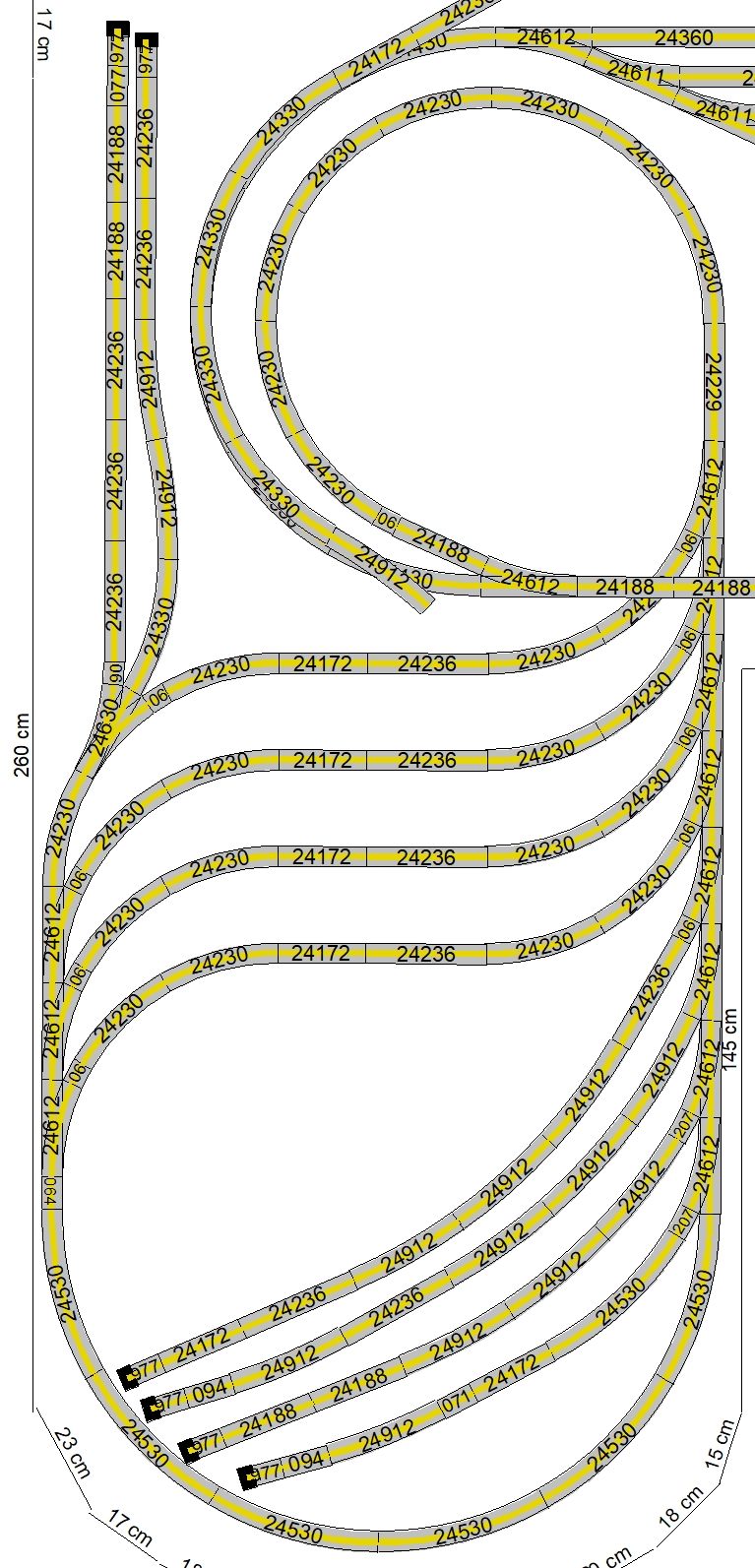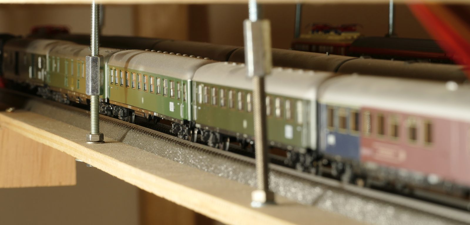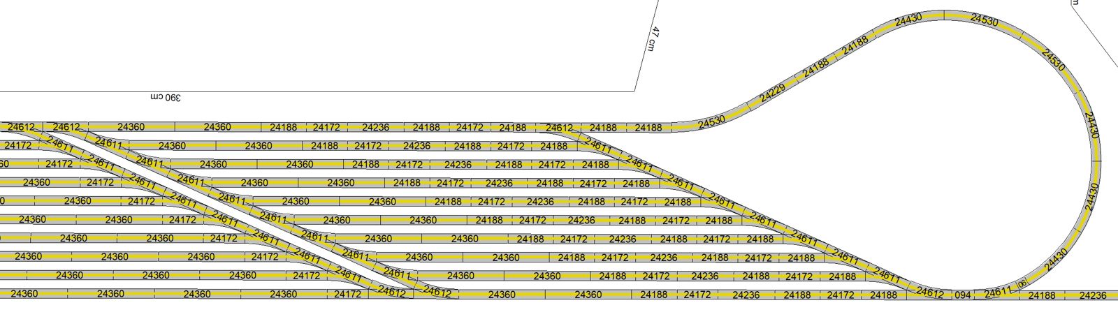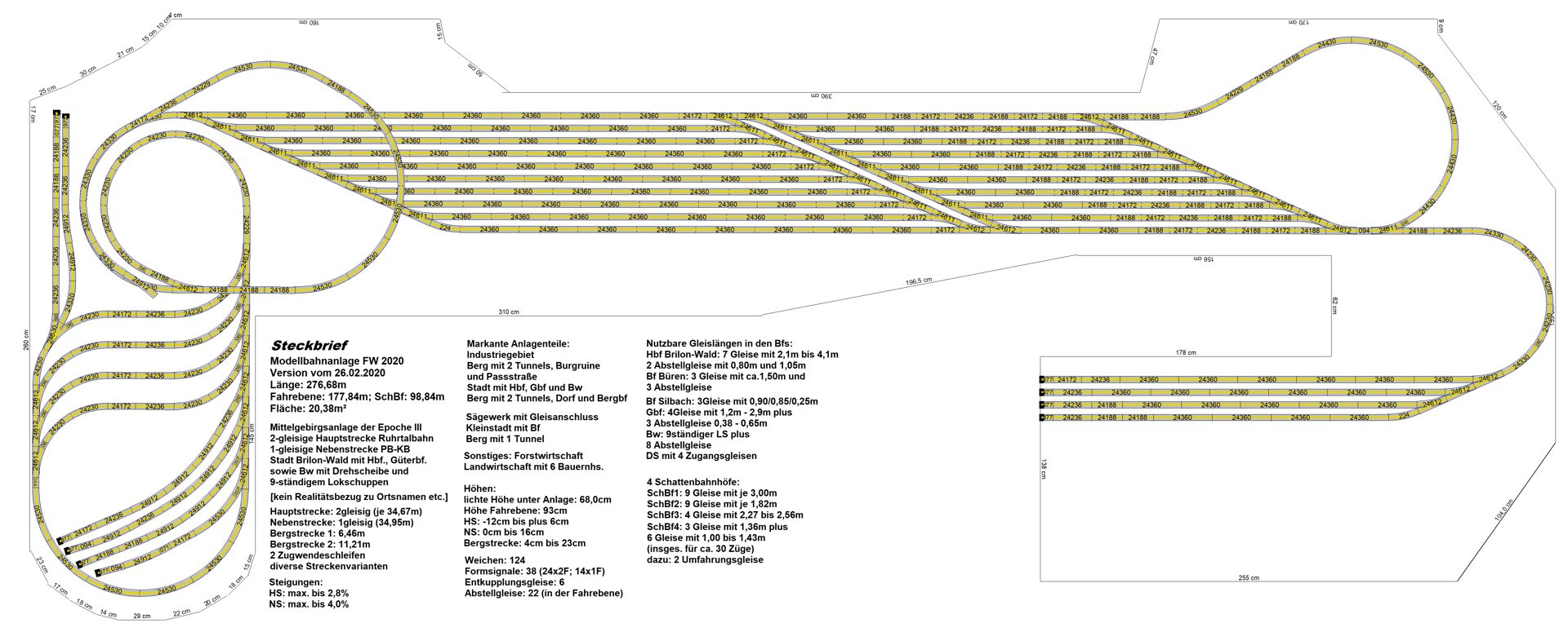 Mein neuestes Projekt. Diese Idee ist aus diesem Jahr 2020, die Umsetzung wird in den ersten Monaten 2020 erfolgen. Nach der Fertigstellung meiner Modellbahnanlage fehlte mir etwas; also kam mir die Idee, unter der Anlage zu erweitern. Oben habe ich keinen Platz mehr für Erweiterungen. Ein weiterer Schattenbahnhof macht Sinn, da ich hier Wagenmaterial bzw. kürzere Züge parken kann. Die Ein- und Ausfahrt erfolgt als Abzweig von der bisherigen langen Ein- und Ausfahrt des Schattenbahnhofs. Es gelang mir, die Höhe der anderen drei Schattenbahnhöfe auch hier einzuhalten. Dazu habe ich schon kleinere Anpassungen an der alten Zufahrt und an dem Unterbau vorgenommen, sodass die neue Zufahrt hineinpasst. Zwischen den vier Durchgangsgleisen und den vier Abstellgleisen (unten im Bild) im SchBf4 ist eine großzügige Öffnung vorgesehen. Auch diesen SchBf werde ich an Gewindestangen M6 aufhängen. Das erste Gleis dient tatsächlich als Durchgangsgleis, die Gleise 2-4 sowie die sechs Abstellgleise nutze ich für kürzere Züge (RAm TEE, VT95, 2xVT98, VT75 u. ä.). Im Januar 2020 habe ich – wie schon im Menüpunkt Entwicklung erwähnt – die erste beiden Schattenbahnhöfe umgebaut; der sehr lange SchBf1 wurde um eine Gleislänge, also 360mm, gekürzt, der andere SchBf2 um die gleiche Strecke verlängert inkl. Umbau von 20 Weichen. Diese Arbeiten sind abgeschlossen. Den neuen SchBf4 habe ich noch einige Male geändert, um viele meiner alten, bisher übrigen C-Gleise möglichst mit zu verwenden. Jetzt, am 26.02.2020, steht der endgültige Ausbauplan für diesen SchBf4. Die zwei neuen, aber sofort defekten Weichenantriebe Märklin 74492 wurde ausgebaut und durch Überbrückung der Mikroendschalter wieder in Stand gesetzt. Übrigens besitzen diese gegenüber der Art.Nr. 74491 nun ca. 1,5m lange, steckbare Anschlusskabel. Zumindest dies ist positiv. Warum sie die Antriebe für Digitalbahner nicht ohne die extrem anfälligen Endschalter anbieten, weiß nur Märklin selbst. Ich kann nur jedem Besitzer einer größeren Märklin-Anlage raten, die Endschalter von vorneherein „lahmzulegen“. Ich werde noch viel Ärger bekommen, wenn die Weichenantriebe nach und nach mittig in fest verschotterten Gleisbetten ausfallen. Ein Ausschneiden im Brett unter der Weiche macht bei zwei, drei oder mehrstöckigen Anlagen auch keinen Sinn.