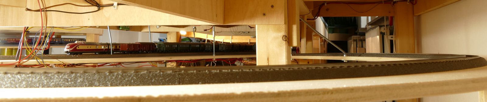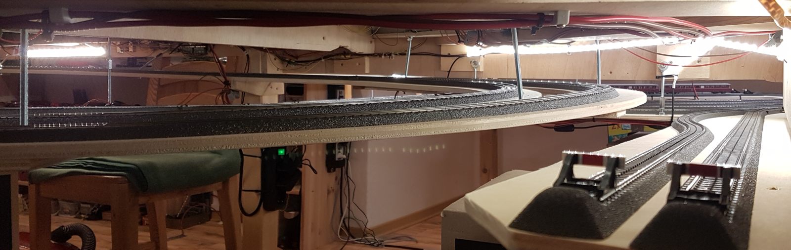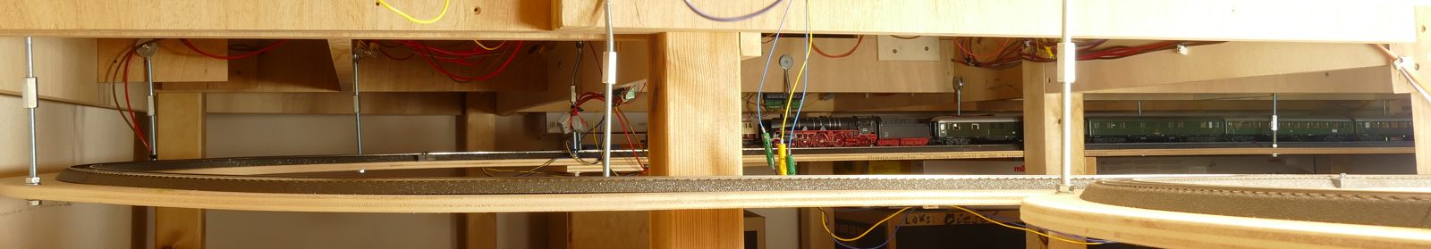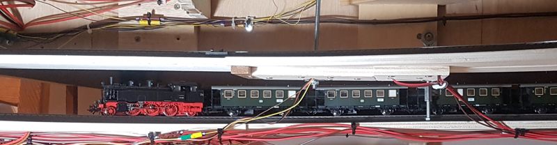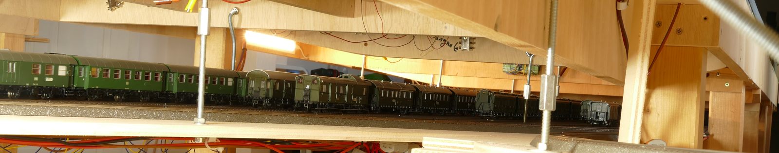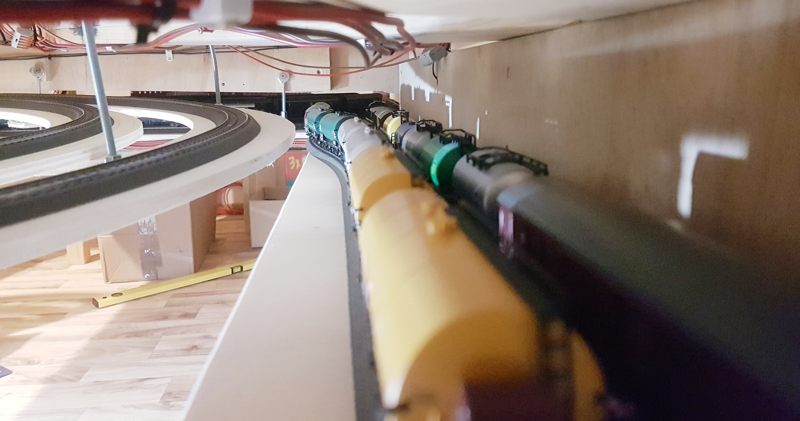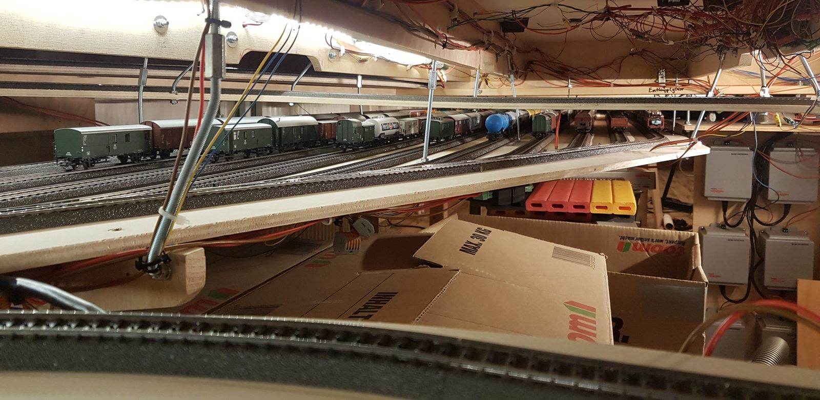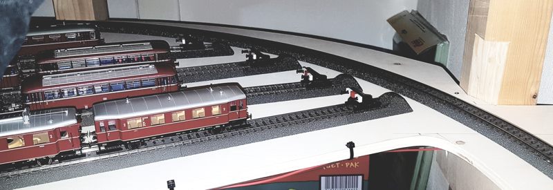 Wir schreiben Februar 2020. Nun sind alle meine Ideen realisiert; auch die Schattenbahnhöfe sind fertiggebaut. Es fehlen noch einzelne Beleuchtungs-LED-Streifen unter der Anlage. Später kann ich dann evtl. Kameras verbauen. Vorerst sitze oder liege ich auf dem Fußboden, um die Züge hier im Schattenbereich einzuparken. Auch eine Möglichkeit, beweglich zu bleiben…