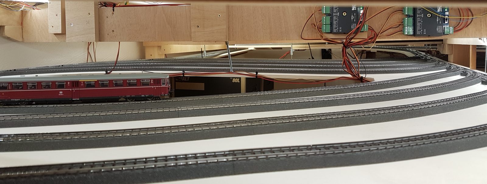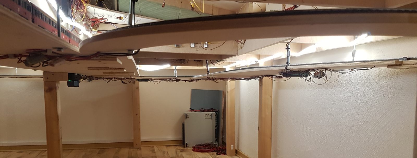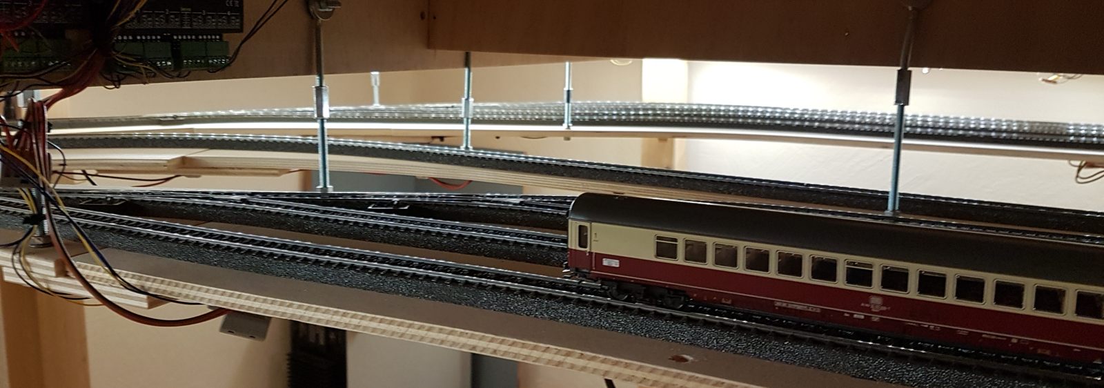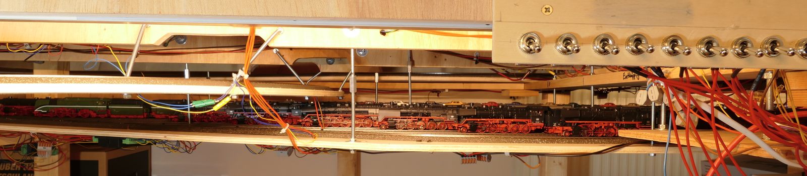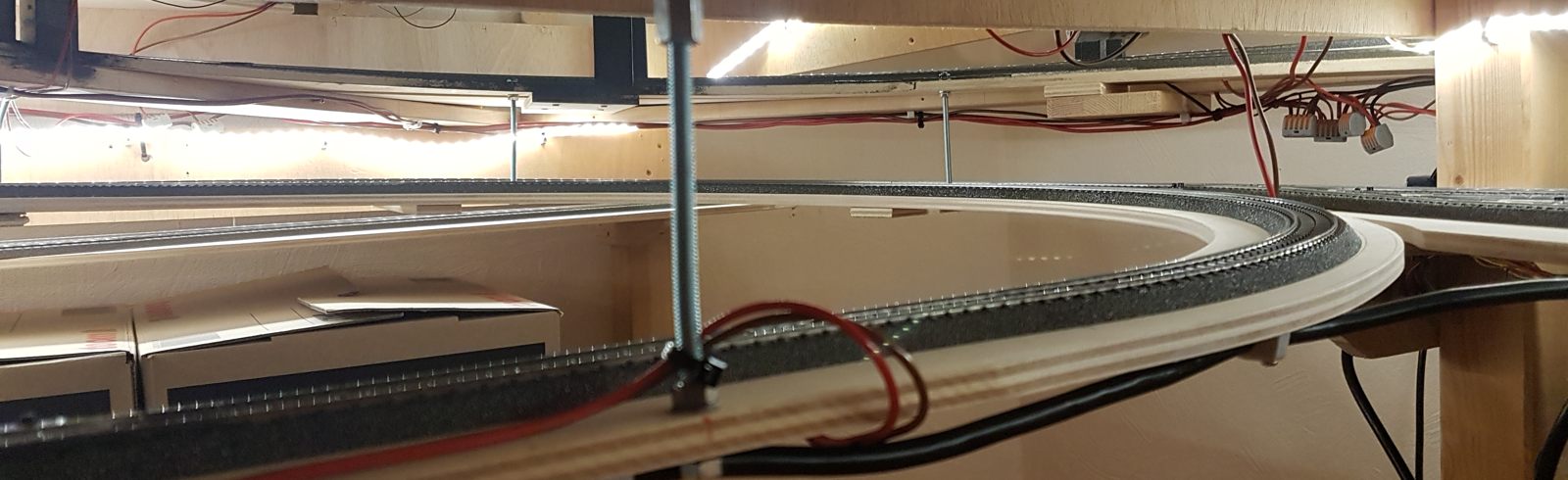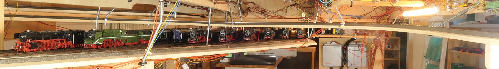 Wir schreiben Februar 2020. Nun sind alle meine Ideen realisiert; auch die Schattenbahnhöfe sind fertiggebaut. Es fehlen noch einzelne Beleuchtungs-LED-Streifen unter der Anlage. Später kann ich dann evtl. Kameras verbauen. Vorerst sitze oder liege ich auf dem Fußboden, um die Züge hier im Schattenbereich einzuparken. Auch eine Möglichkeit, beweglich zu bleiben…