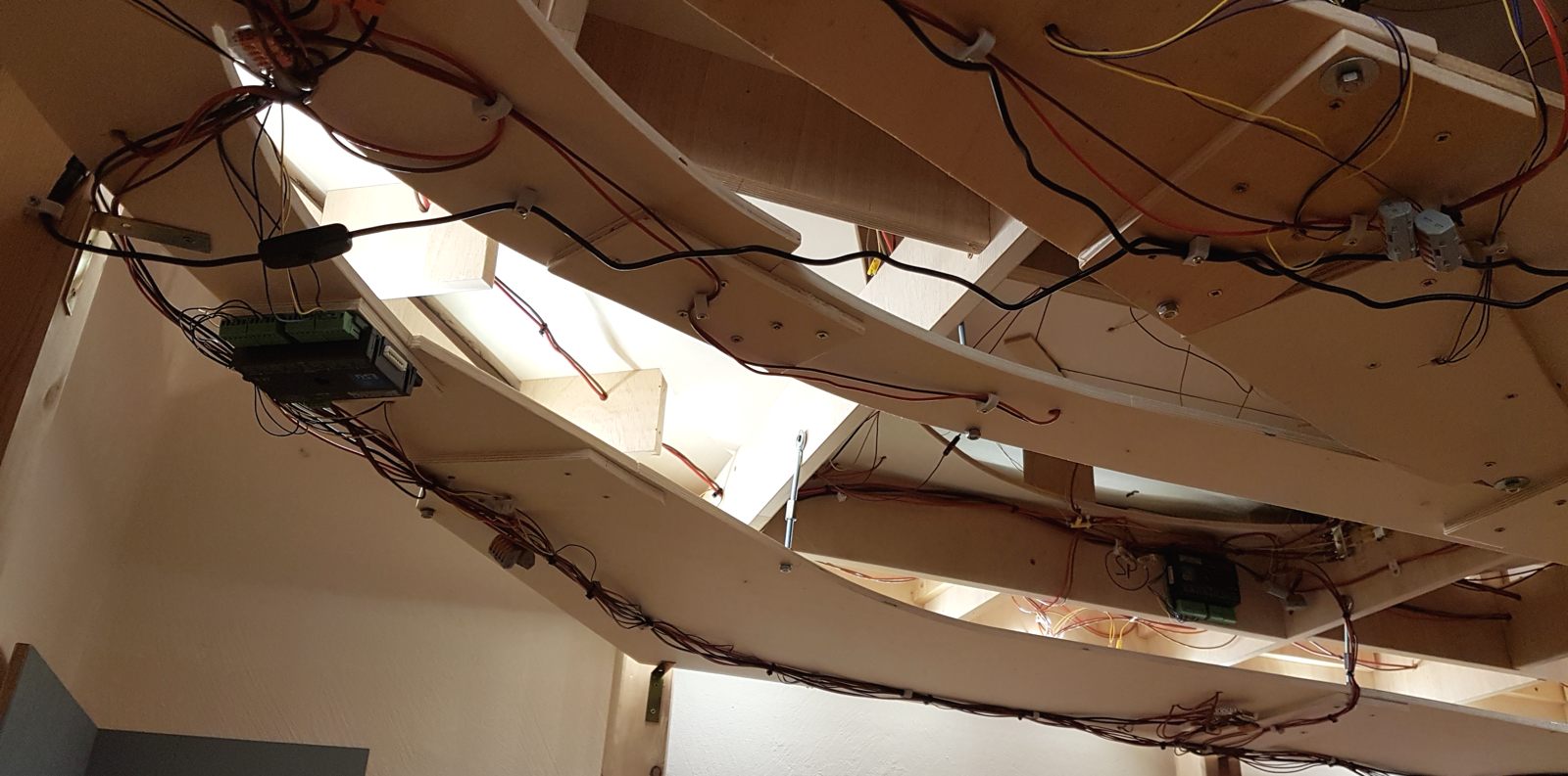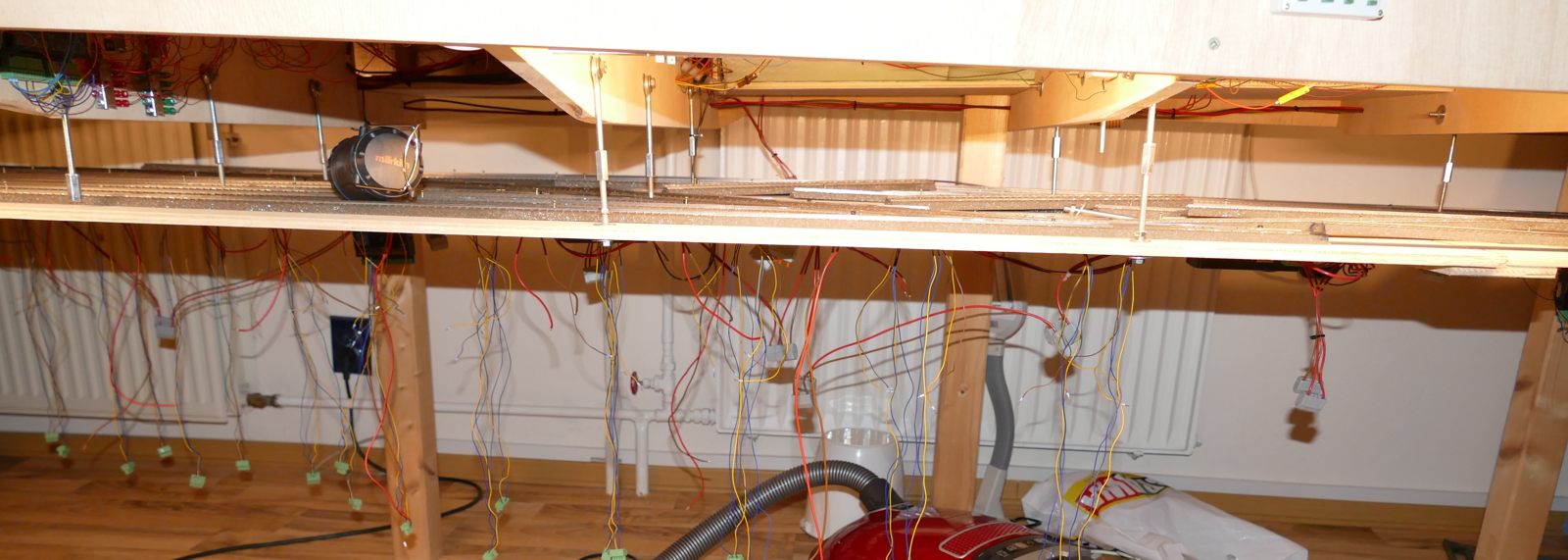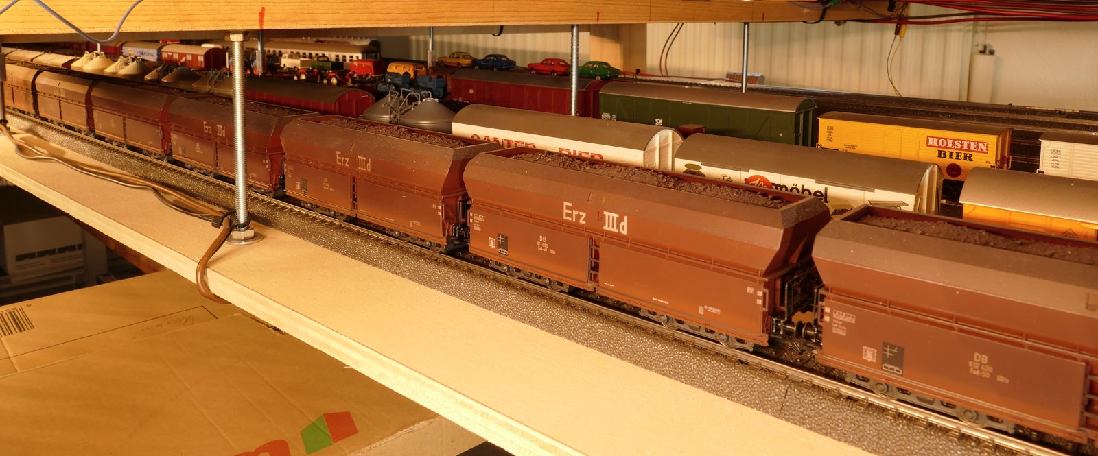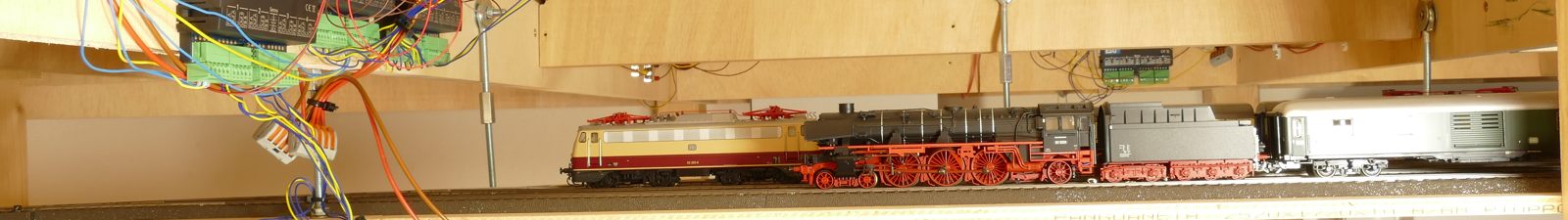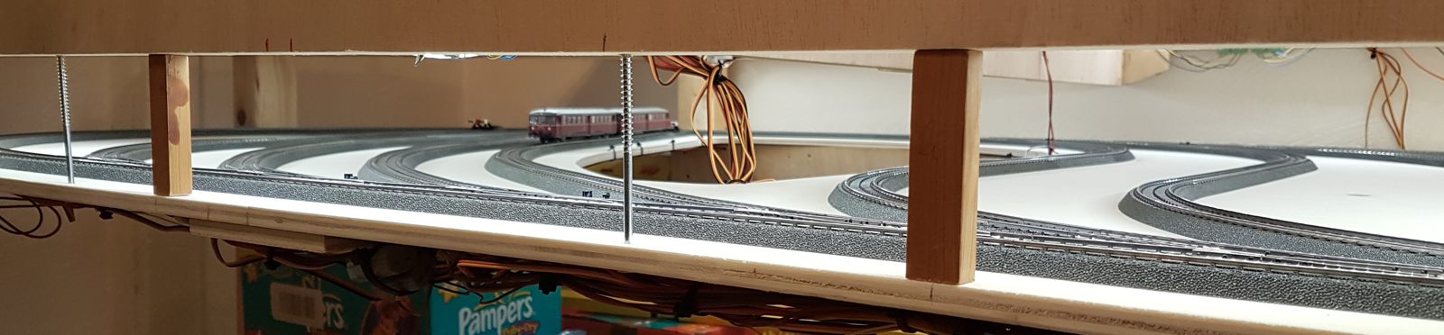 Wir schreiben Februar 2020. Nun sind alle meine Ideen realisiert; auch die Schattenbahnhöfe sind fertiggebaut. Es fehlen noch einzelne Beleuchtungs-LED-Streifen unter der Anlage. Später kann ich dann evtl. Kameras verbauen. Vorerst sitze oder liege ich auf dem Fußboden, um die Züge hier im Schattenbereich einzuparken. Auch eine Möglichkeit, beweglich zu bleiben…