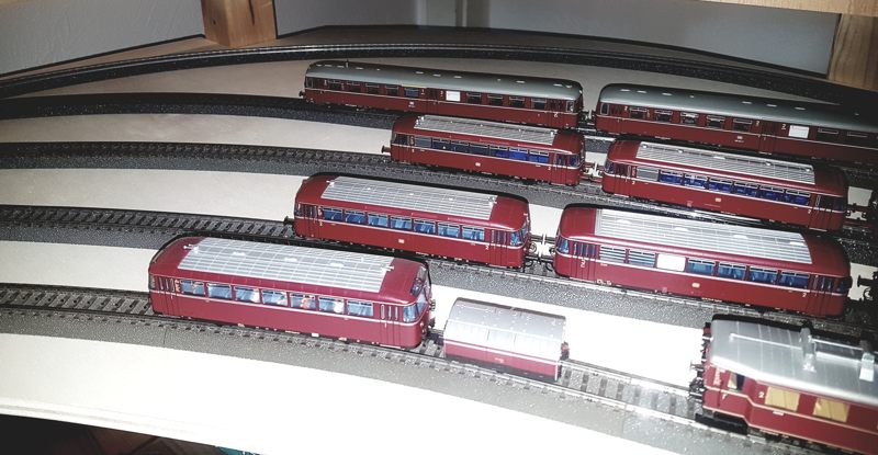 PS: Der Roco-Akkutriebwagen 515 (Art.Nr. 78081) rollt nicht über die Dreiweiche 24630 von Märklin. Er verklemmt sich mit der Weichenlaterne resp. dem Stellhebel. Daher habe ich das Gleuisstück als Abstellgleis und das untere, vierte als Durchgangsgleis verwendet!