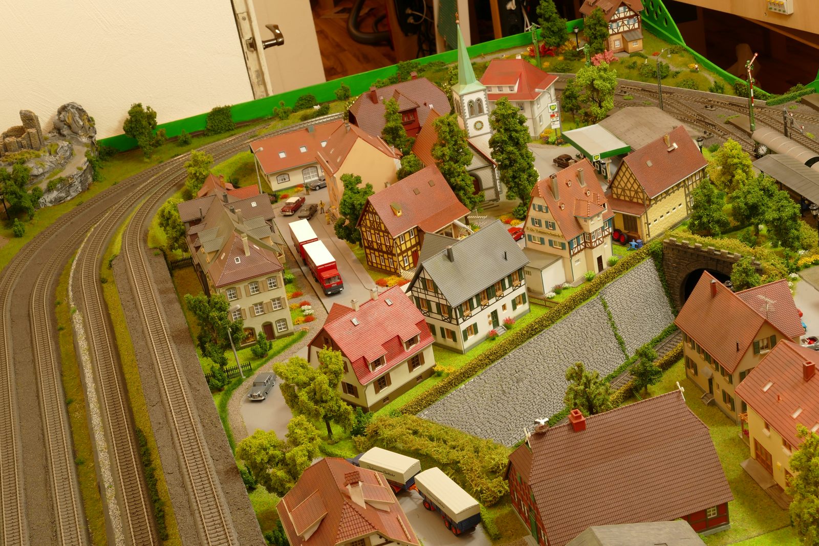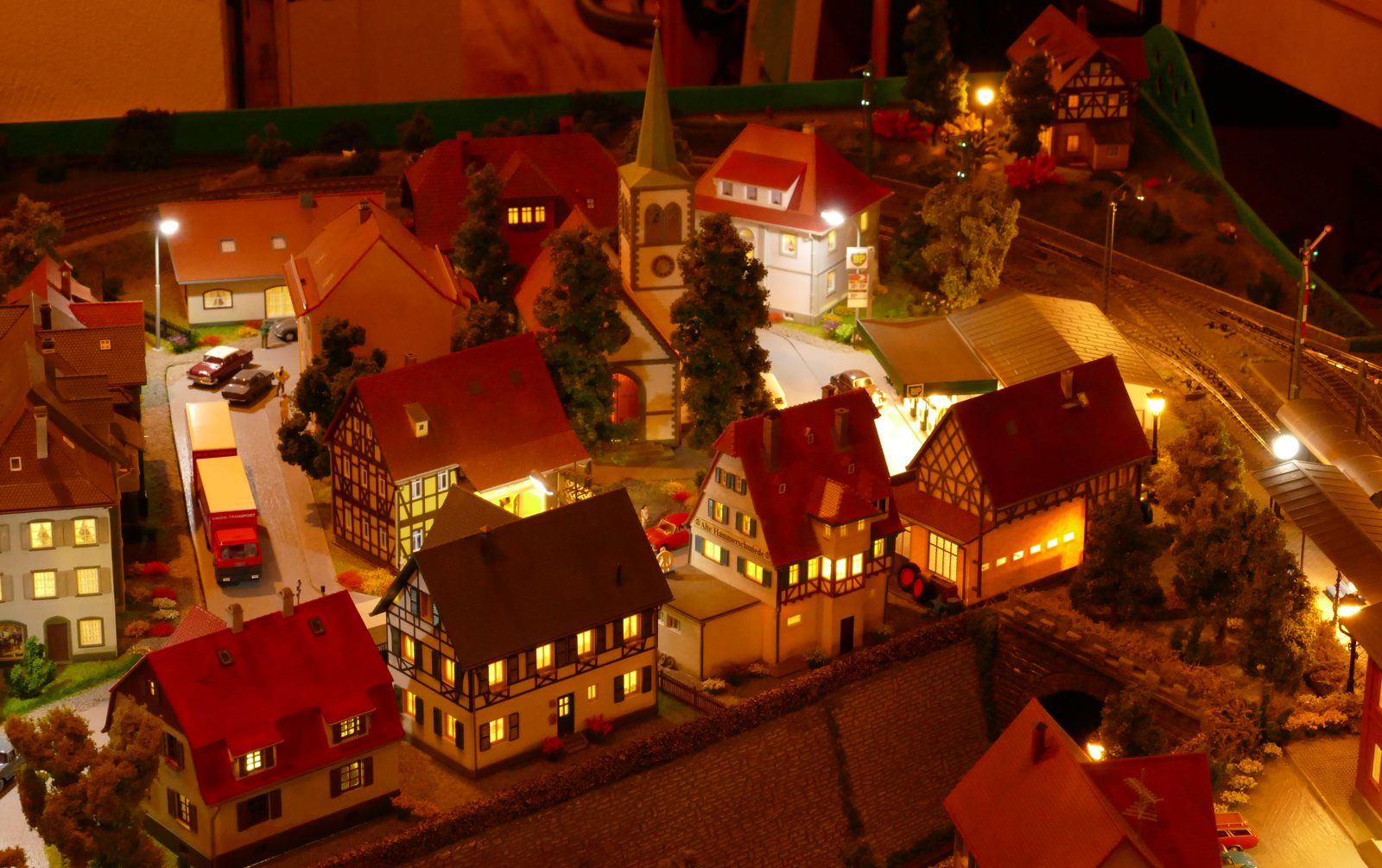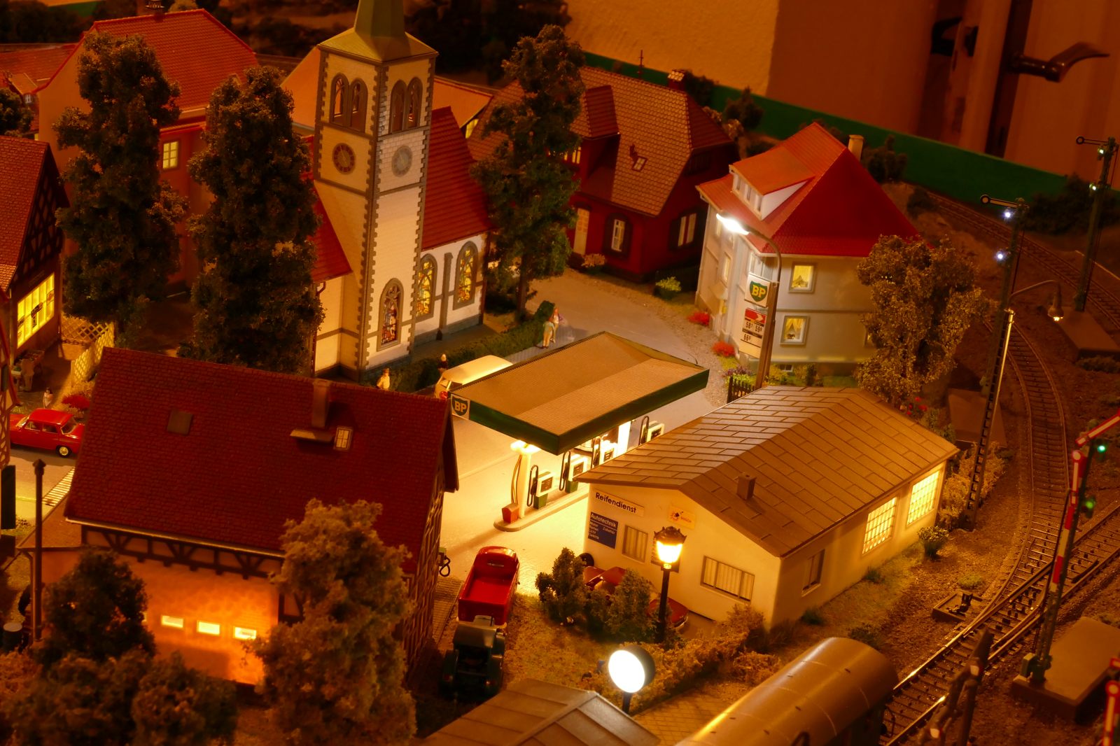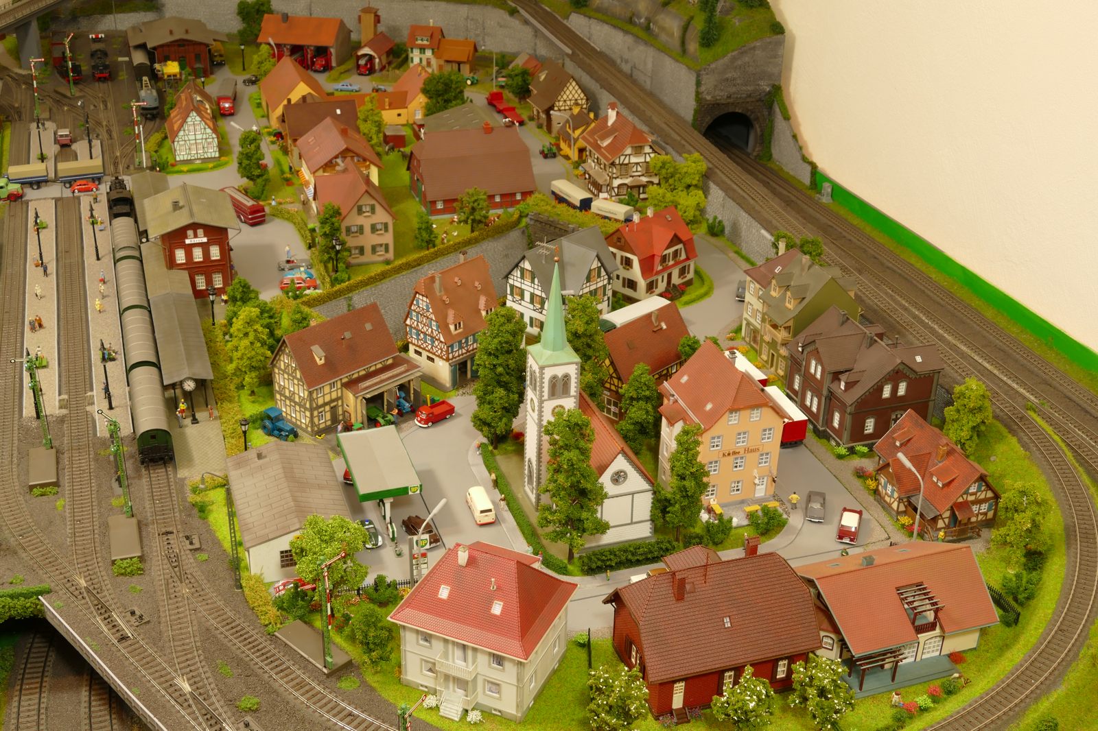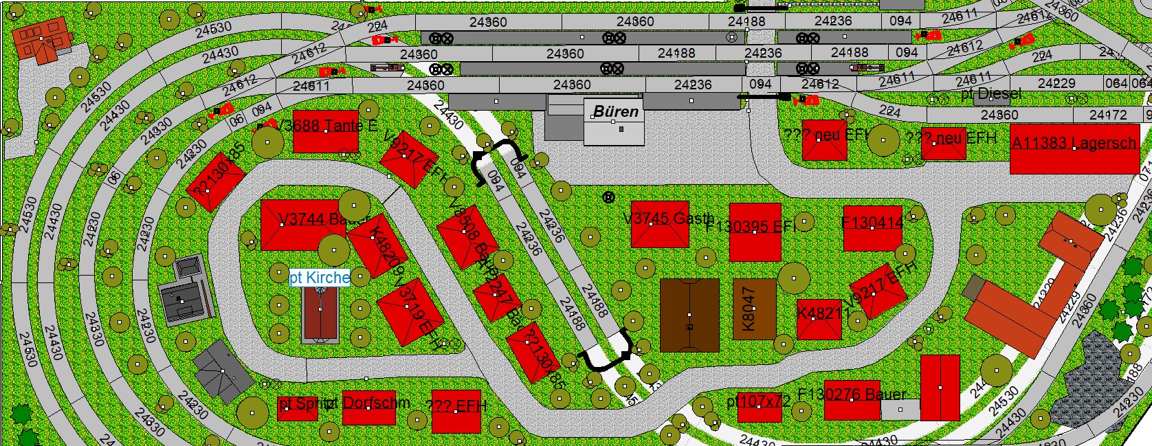 Büren ist eine Kleinstadt an der Almetalbahn zwischen Paderborn und Brilon. Das Städtchen ist noch immer deutlich geprägt durch landwirtschaftliche Strukturen, auch in der Stadt selbst. Viele Bauernhöfe und wenig Industrie, so kann man die Situation in der Bahnepoche III – etwa 1945 bis 1970 – vereinfacht charakterisieren. Mehrere Kirchen und Tankstellen kann ich wegen Platzmangel nicht zeigen, aber doch den Charakter andeuten. Auch an die unübersehbare Feuerwehr in der Burgstraße wird sich jeder Bürener erinnern. Bei mir ist sie ebenfalls unübersehbar. Als kleine Reminiszenz an meinen Papa habe ich seinen Arbeitgeber von Anfang der 1950er bis 1968, die Landwirtschaftsfirma W. Betten, ebenfalls versucht mit einzubauen. Der tatsächlich realisierte Aufbau unterscheidet sich merklich von der ursprunglichen Planung in Betzg auf die Anordnung der Gebäude. Man schaue sich nur den großen Bauernhof im Plan ganz rechts an. Dort steht tatsächlich das Feuerwehrhaus. Viele Dinge sind vorher nicht perfekt planbar und es ist für mich besser, ich lege beim Bauen neue Kriterien an, als mich stur an die Planung zu halten. Natürlich könnte ich den Plan nachträglich an die Realität angleichen, aber die Unterschiede zu sehen, finde ich noch reizvoller.