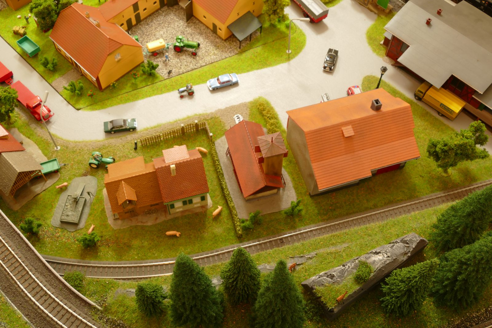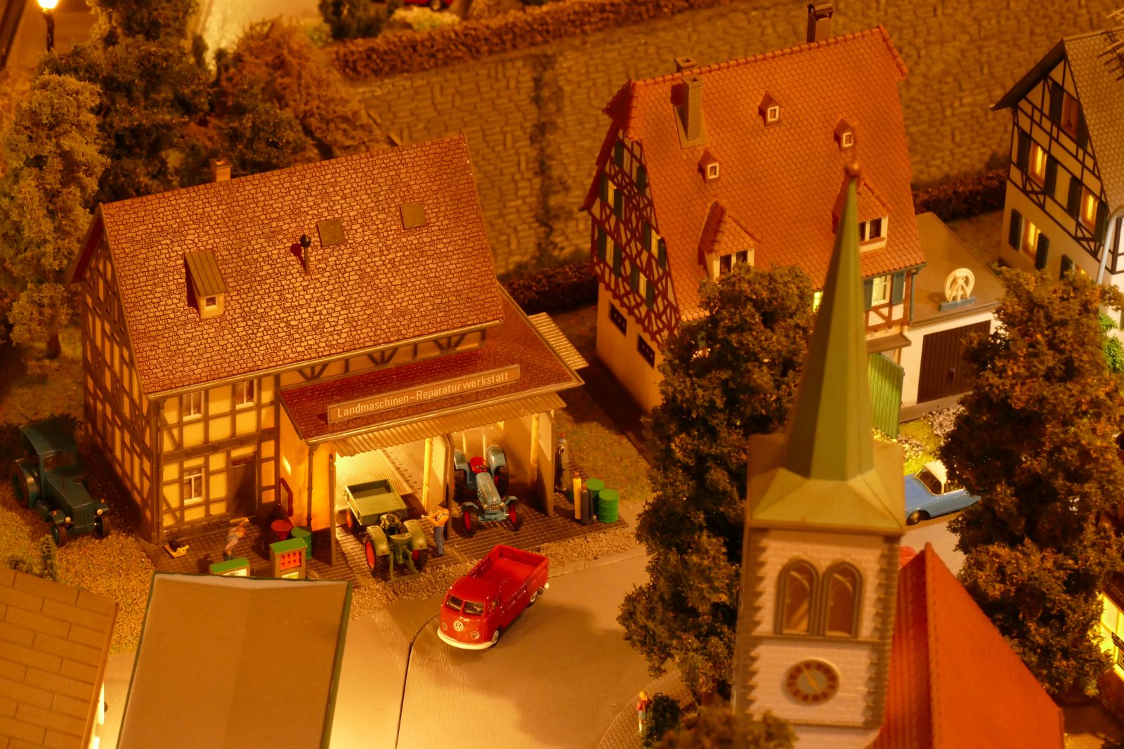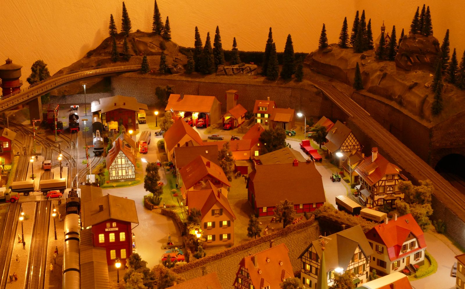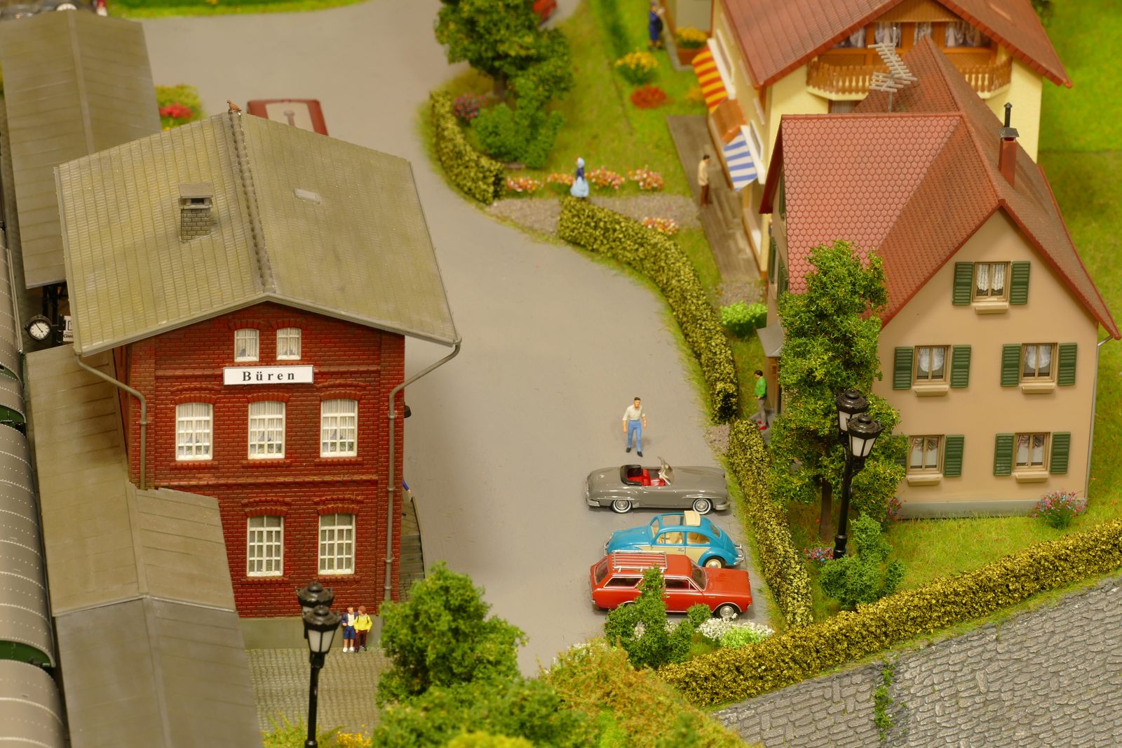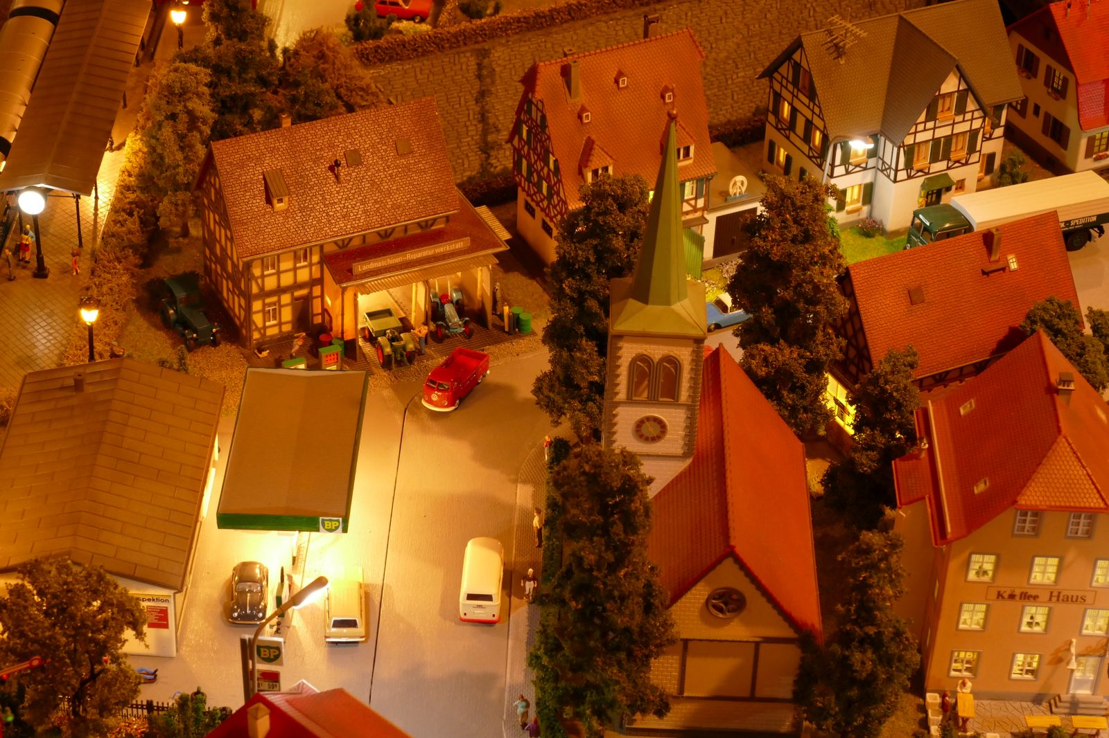 Büren ist eine Kleinstadt an der Almetalbahn zwischen Paderborn und Brilon. Das Städtchen ist noch immer deutlich geprägt durch landwirtschaftliche Strukturen, auch in der Stadt selbst. Viele Bauernhöfe und wenig Industrie, so kann man die Situation in der Bahnepoche III – etwa 1945 bis 1970 – vereinfacht charakterisieren. Mehrere Kirchen und Tankstellen kann ich wegen Platzmangel nicht zeigen, aber doch den Charakter andeuten. Auch an die unübersehbare Feuerwehr in der Burgstraße wird sich jeder Bürener erinnern. Bei mir ist sie ebenfalls unübersehbar. Als kleine Reminiszenz an meinen Papa habe ich seinen Arbeitgeber von Anfang der 1950er bis 1968, die Landwirtschaftsfirma W. Betten, ebenfalls versucht mit einzubauen. Der tatsächlich realisierte Aufbau unterscheidet sich merklich von der ursprunglichen Planung in Betzg auf die Anordnung der Gebäude. Man schaue sich nur den großen Bauernhof im Plan ganz rechts an. Dort steht tatsächlich das Feuerwehrhaus. Viele Dinge sind vorher nicht perfekt planbar und es ist für mich besser, ich lege beim Bauen neue Kriterien an, als mich stur an die Planung zu halten. Natürlich könnte ich den Plan nachträglich an die Realität angleichen, aber die Unterschiede zu sehen, finde ich noch reizvoller.