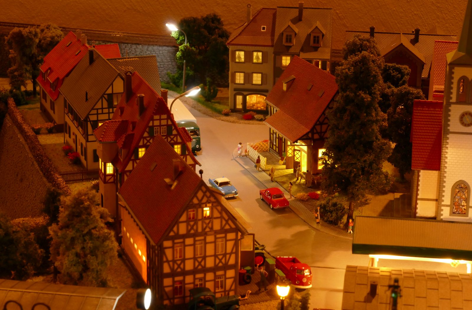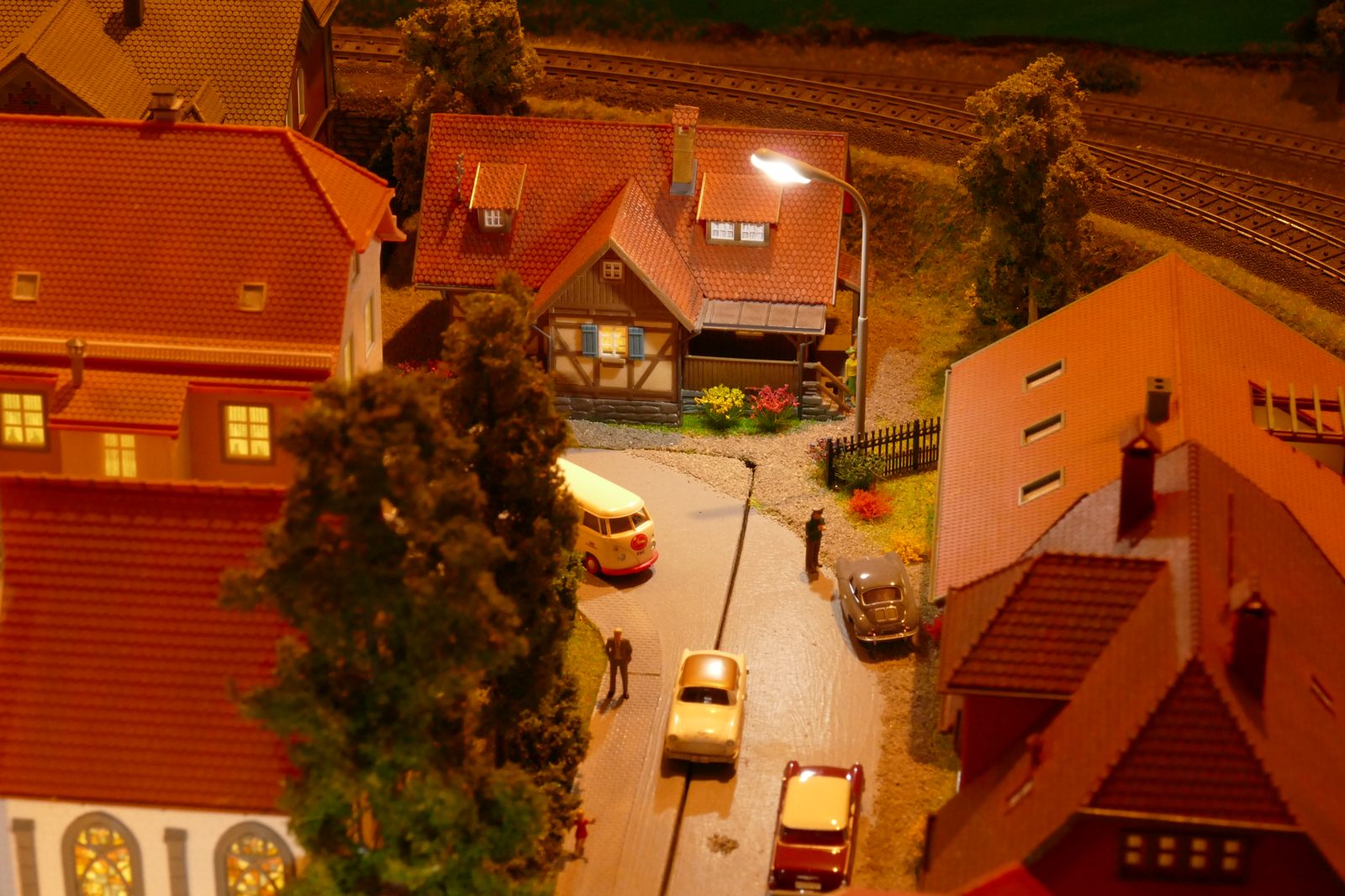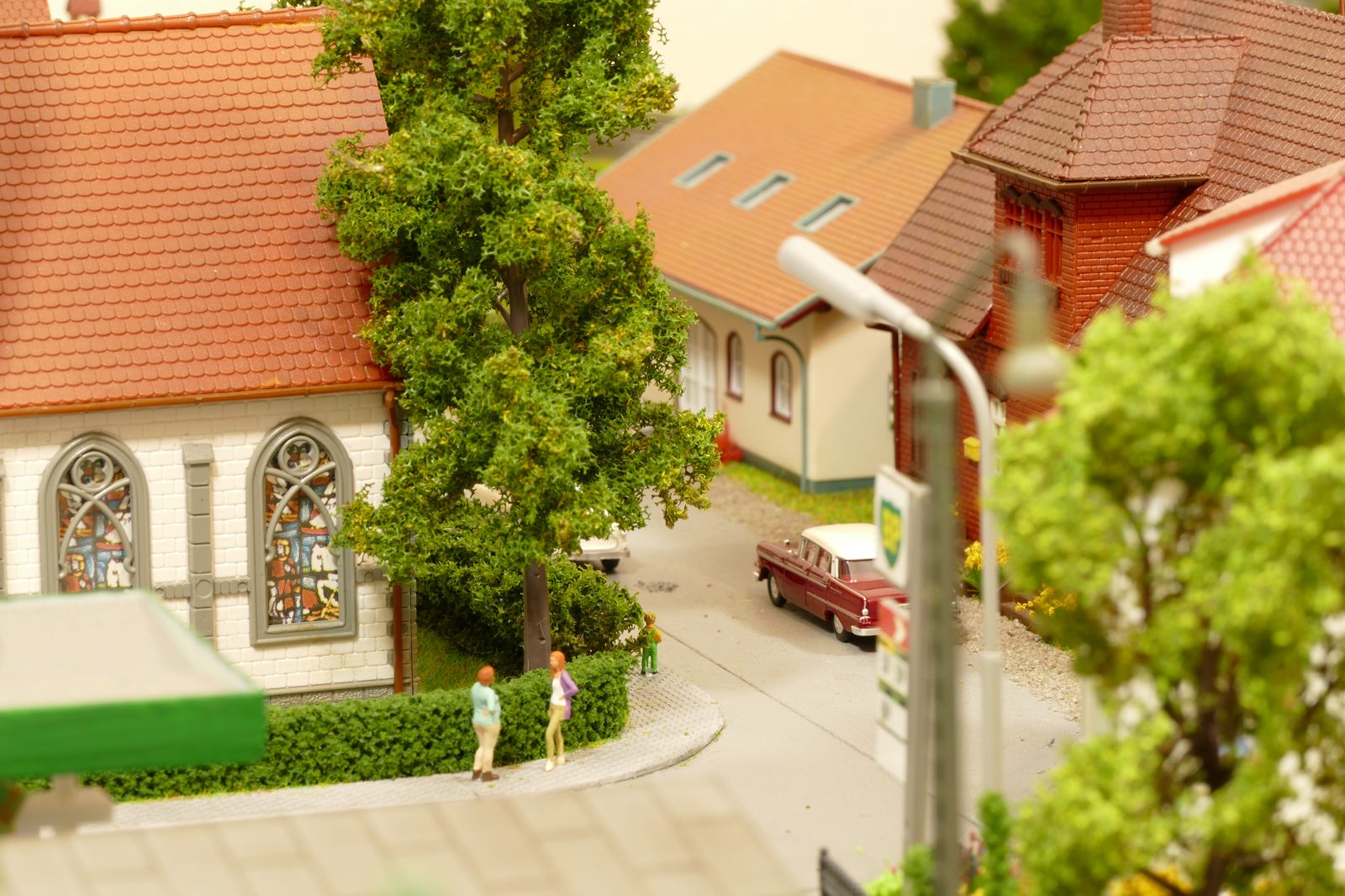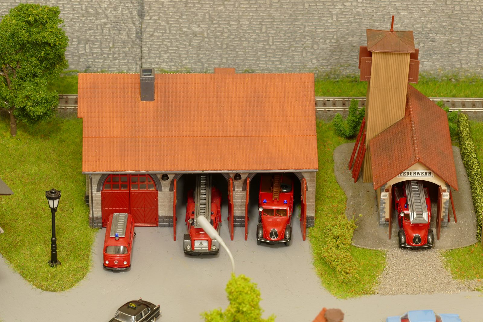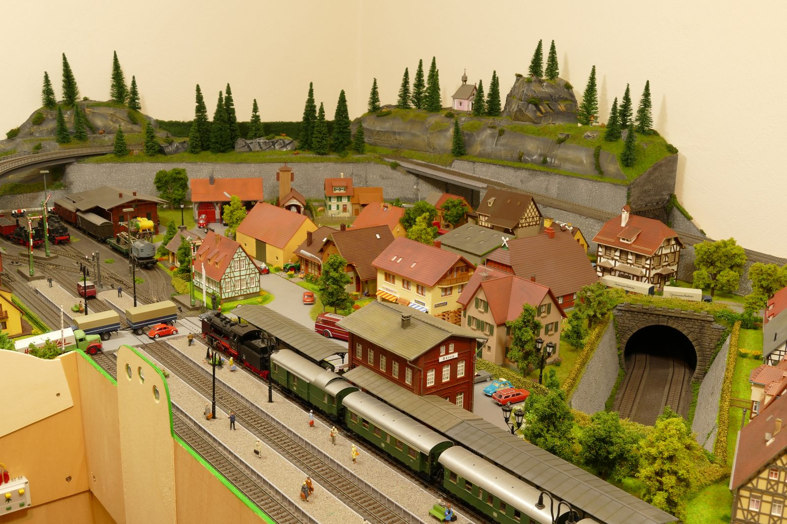 Büren ist eine Kleinstadt an der Almetalbahn zwischen Paderborn und Brilon. Das Städtchen ist noch immer deutlich geprägt durch landwirtschaftliche Strukturen, auch in der Stadt selbst. Viele Bauernhöfe und wenig Industrie, so kann man die Situation in der Bahnepoche III – etwa 1945 bis 1970 – vereinfacht charakterisieren. Mehrere Kirchen und Tankstellen kann ich wegen Platzmangel nicht zeigen, aber doch den Charakter andeuten. Auch an die unübersehbare Feuerwehr in der Burgstraße wird sich jeder Bürener erinnern. Bei mir ist sie ebenfalls unübersehbar. Als kleine Reminiszenz an meinen Papa habe ich seinen Arbeitgeber von Anfang der 1950er bis 1968, die Landwirtschaftsfirma W. Betten, ebenfalls versucht mit einzubauen. Der tatsächlich realisierte Aufbau unterscheidet sich merklich von der ursprunglichen Planung in Betzg auf die Anordnung der Gebäude. Man schaue sich nur den großen Bauernhof im Plan ganz rechts an. Dort steht tatsächlich das Feuerwehrhaus. Viele Dinge sind vorher nicht perfekt planbar und es ist für mich besser, ich lege beim Bauen neue Kriterien an, als mich stur an die Planung zu halten. Natürlich könnte ich den Plan nachträglich an die Realität angleichen, aber die Unterschiede zu sehen, finde ich noch reizvoller.