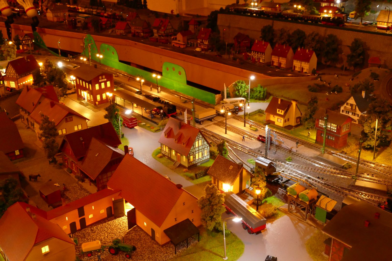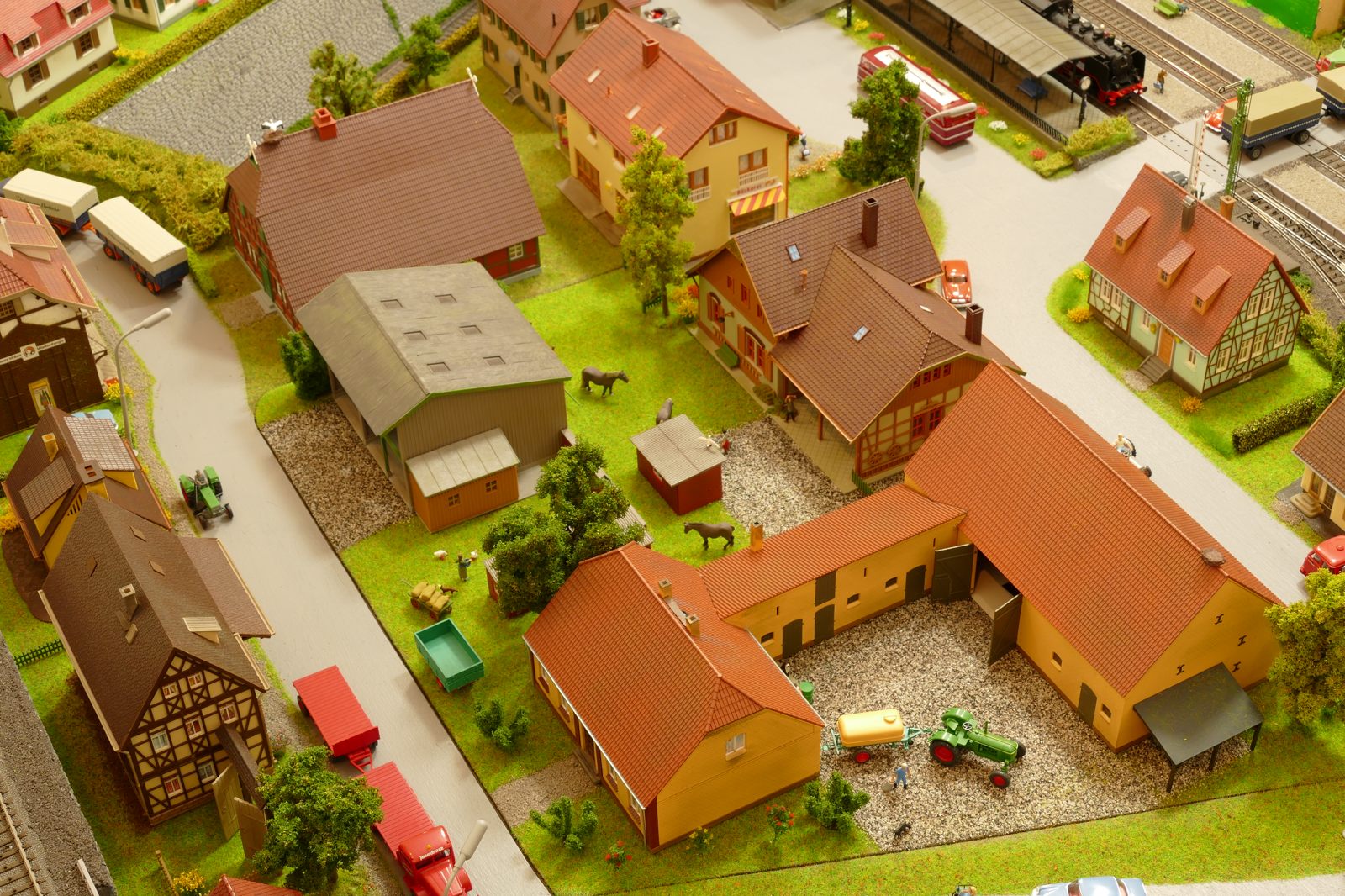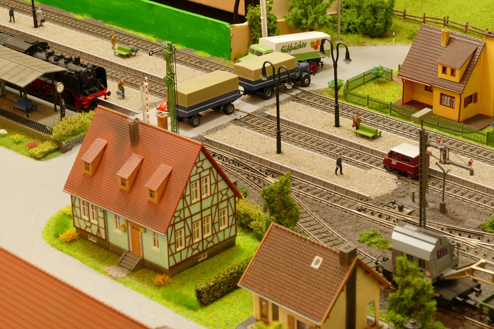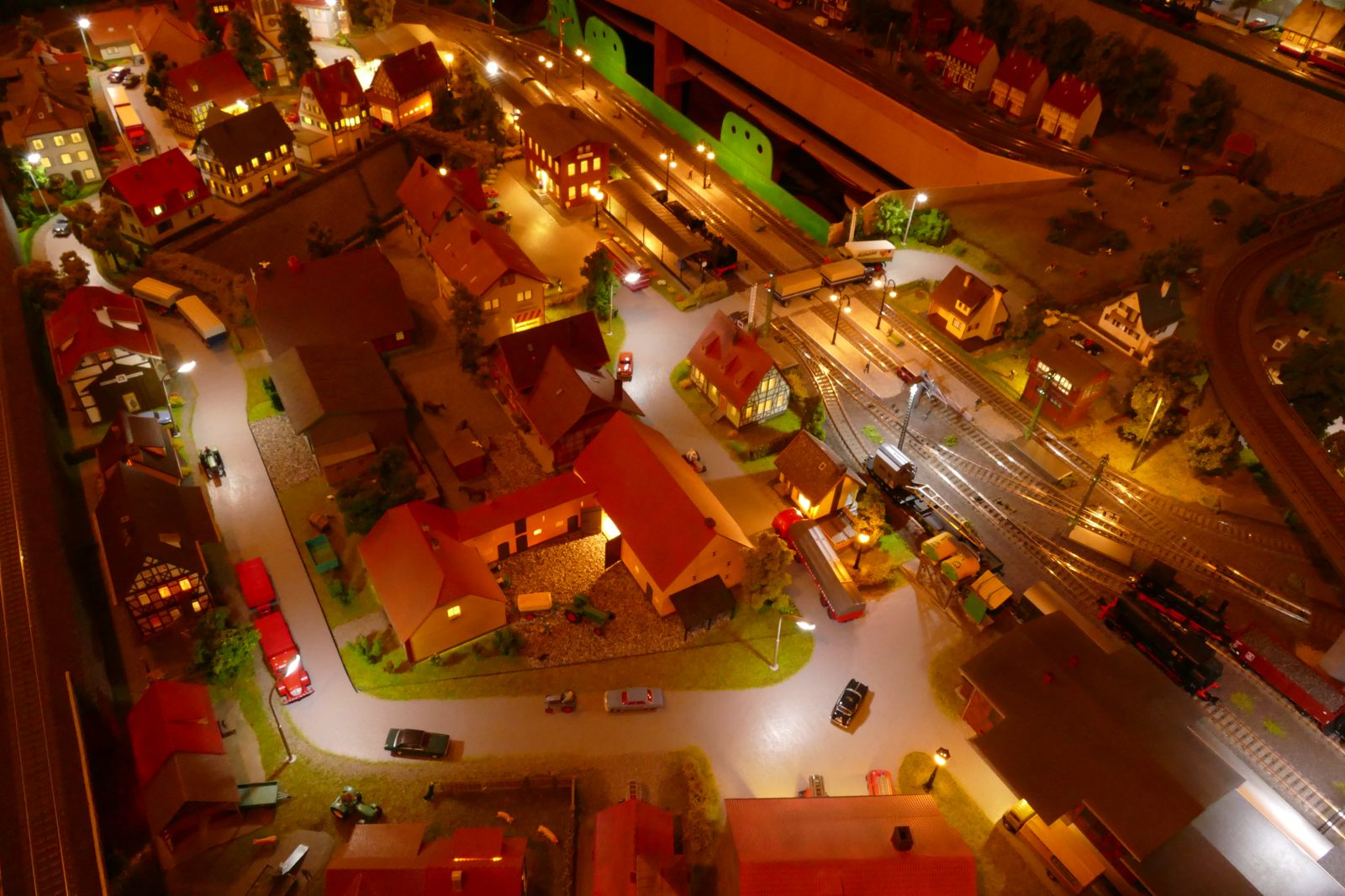 Büren ist eine Kleinstadt an der Almetalbahn zwischen Paderborn und Brilon. Das Städtchen ist noch immer deutlich geprägt durch landwirtschaftliche Strukturen, auch in der Stadt selbst. Viele Bauernhöfe und wenig Industrie, so kann man die Situation in der Bahnepoche III – etwa 1945 bis 1970 – vereinfacht charakterisieren. Mehrere Kirchen und Tankstellen kann ich wegen Platzmangel nicht zeigen, aber doch den Charakter andeuten. Auch an die unübersehbare Feuerwehr in der Burgstraße wird sich jeder Bürener erinnern. Bei mir ist sie ebenfalls unübersehbar. Als kleine Reminiszenz an meinen Papa habe ich seinen Arbeitgeber von Anfang der 1950er bis 1968, die Landwirtschaftsfirma W. Betten, ebenfalls versucht mit einzubauen. Der tatsächlich realisierte Aufbau unterscheidet sich merklich von der ursprunglichen Planung in Betzg auf die Anordnung der Gebäude. Man schaue sich nur den großen Bauernhof im Plan ganz rechts an. Dort steht tatsächlich das Feuerwehrhaus. Viele Dinge sind vorher nicht perfekt planbar und es ist für mich besser, ich lege beim Bauen neue Kriterien an, als mich stur an die Planung zu halten. Natürlich könnte ich den Plan nachträglich an die Realität angleichen, aber die Unterschiede zu sehen, finde ich noch reizvoller.