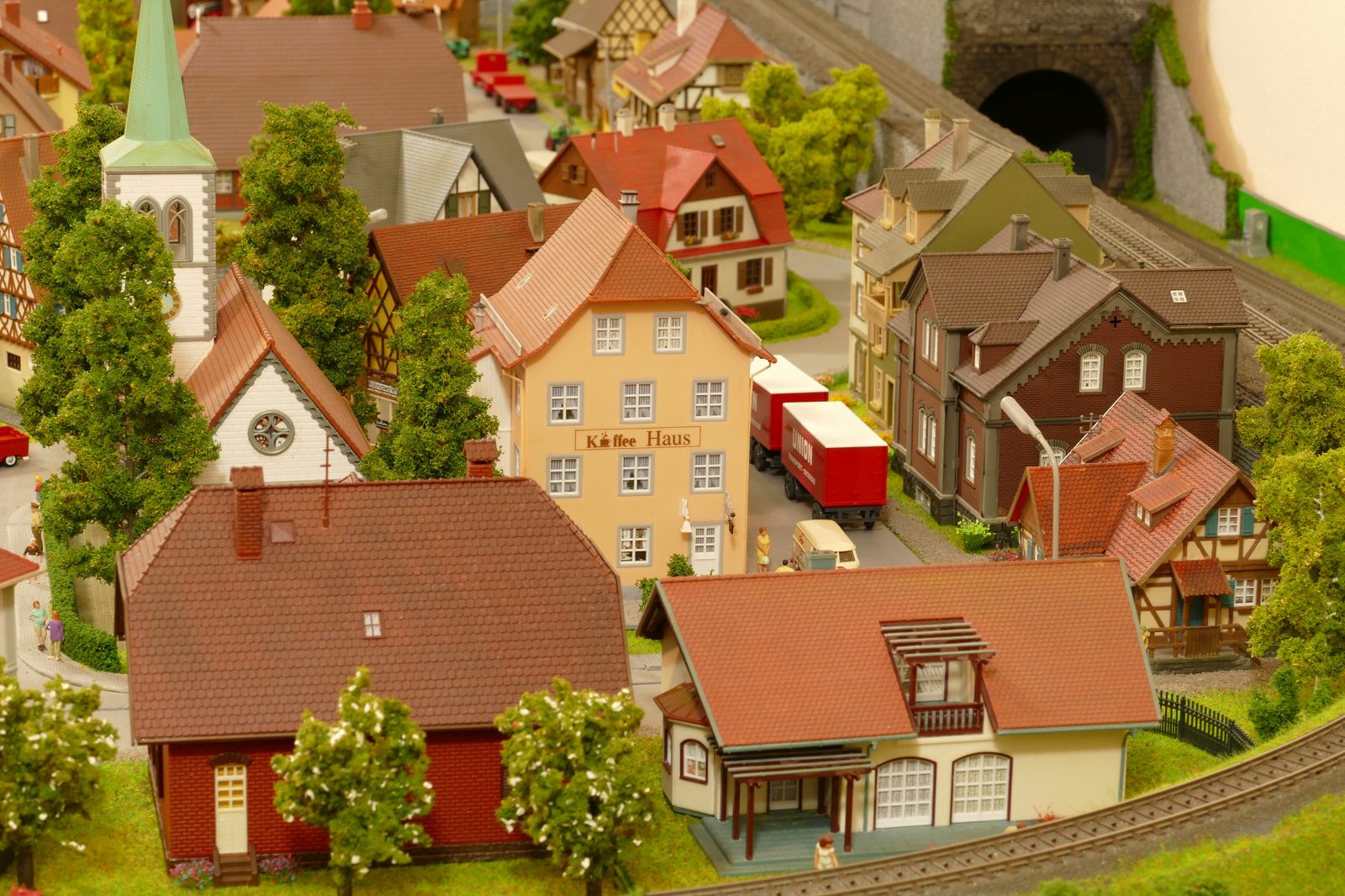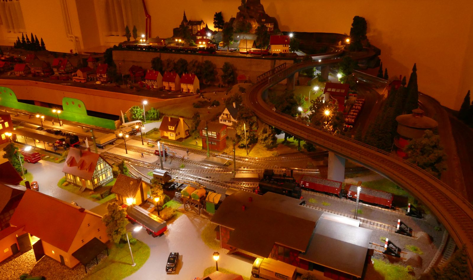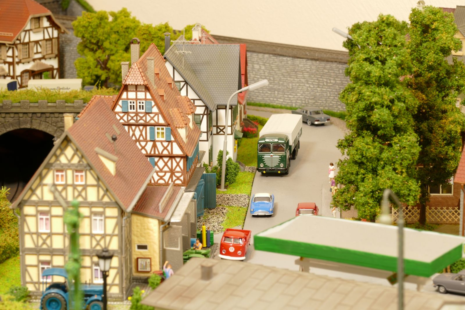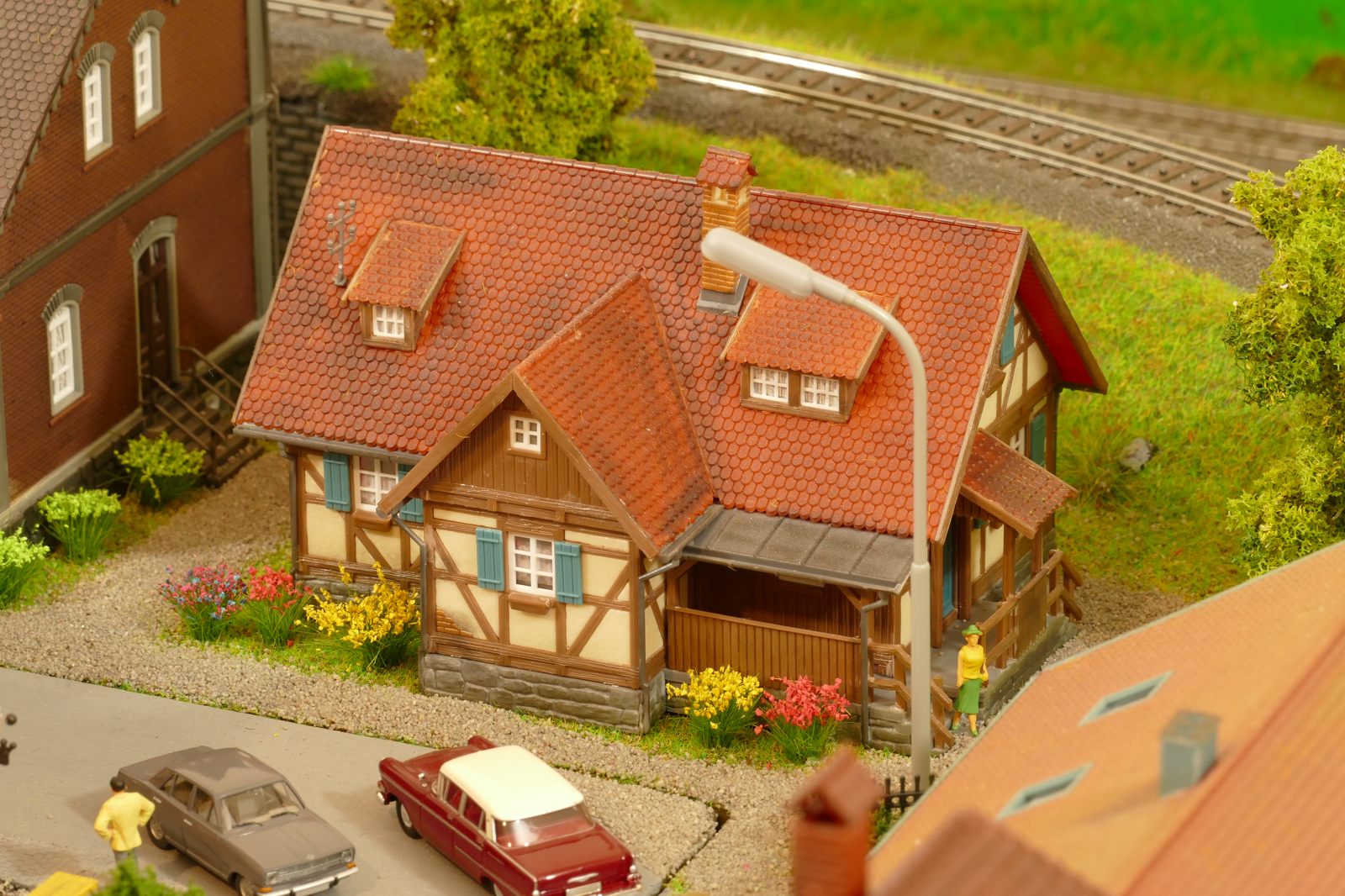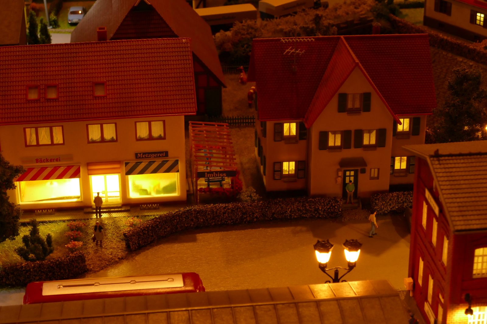 Büren ist eine Kleinstadt an der Almetalbahn zwischen Paderborn und Brilon. Das Städtchen ist noch immer deutlich geprägt durch landwirtschaftliche Strukturen, auch in der Stadt selbst. Viele Bauernhöfe und wenig Industrie, so kann man die Situation in der Bahnepoche III – etwa 1945 bis 1970 – vereinfacht charakterisieren. Mehrere Kirchen und Tankstellen kann ich wegen Platzmangel nicht zeigen, aber doch den Charakter andeuten. Auch an die unübersehbare Feuerwehr in der Burgstraße wird sich jeder Bürener erinnern. Bei mir ist sie ebenfalls unübersehbar. Als kleine Reminiszenz an meinen Papa habe ich seinen Arbeitgeber von Anfang der 1950er bis 1968, die Landwirtschaftsfirma W. Betten, ebenfalls versucht mit einzubauen. Der tatsächlich realisierte Aufbau unterscheidet sich merklich von der ursprunglichen Planung in Betzg auf die Anordnung der Gebäude. Man schaue sich nur den großen Bauernhof im Plan ganz rechts an. Dort steht tatsächlich das Feuerwehrhaus. Viele Dinge sind vorher nicht perfekt planbar und es ist für mich besser, ich lege beim Bauen neue Kriterien an, als mich stur an die Planung zu halten. Natürlich könnte ich den Plan nachträglich an die Realität angleichen, aber die Unterschiede zu sehen, finde ich noch reizvoller.
