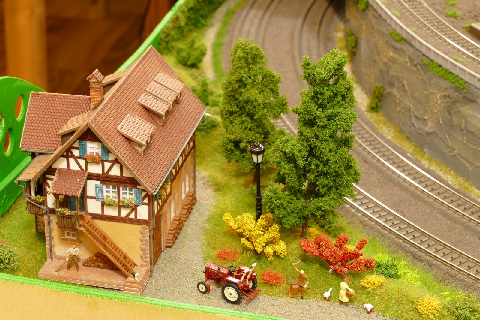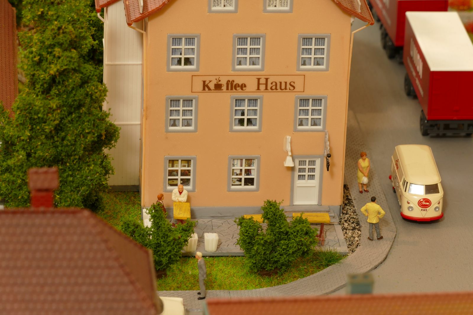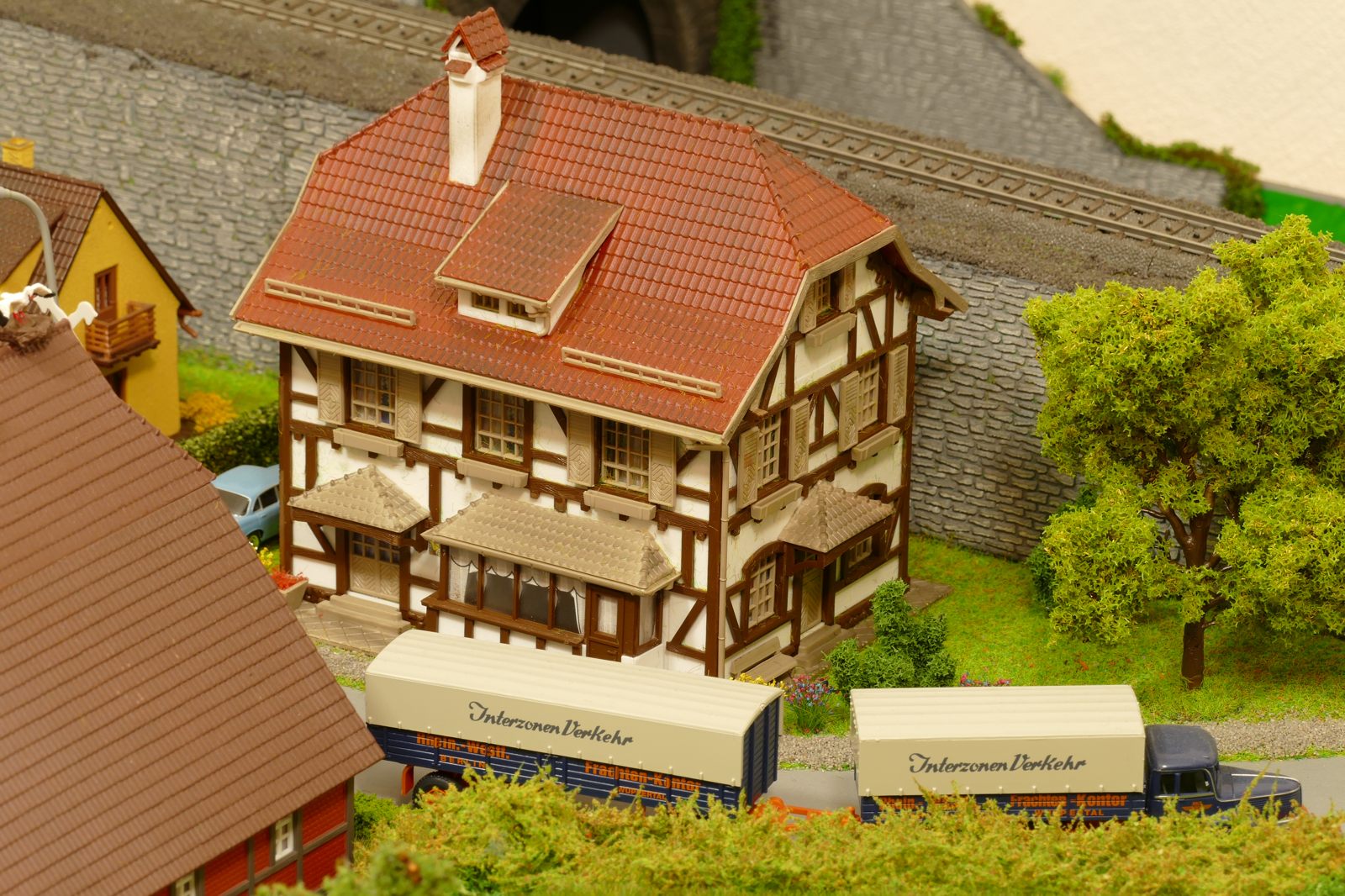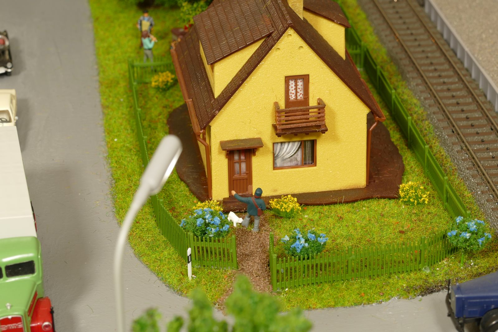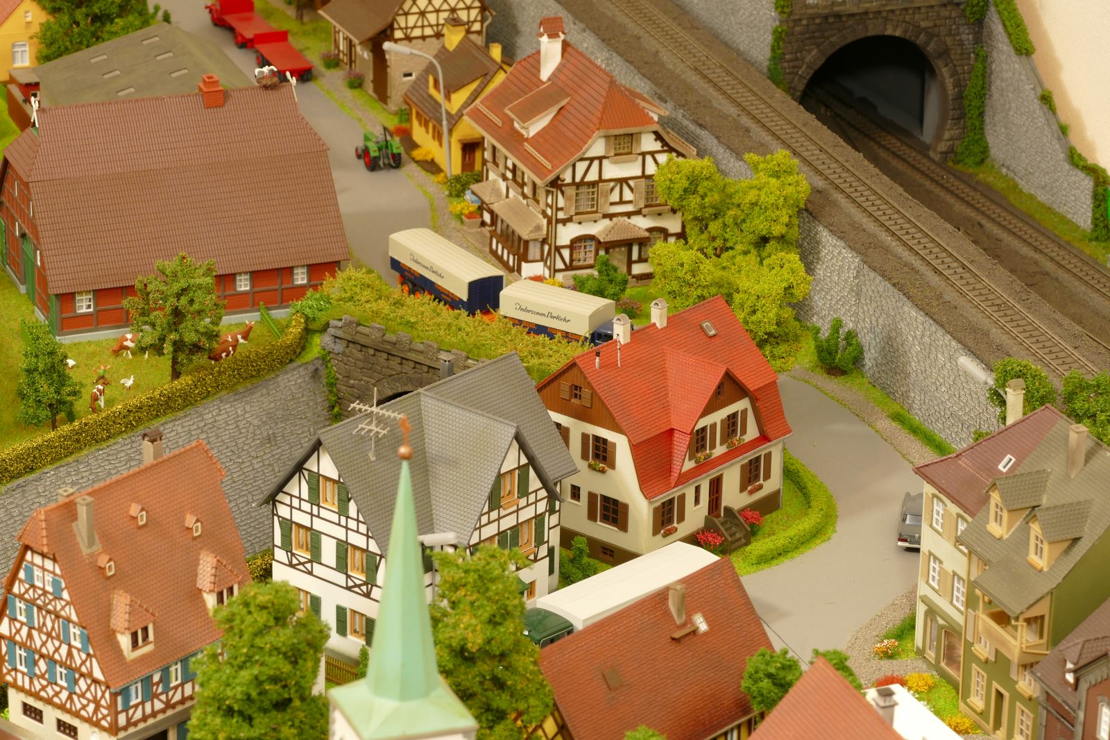 Büren ist eine Kleinstadt an der Almetalbahn zwischen Paderborn und Brilon. Das Städtchen ist noch immer deutlich geprägt durch landwirtschaftliche Strukturen, auch in der Stadt selbst. Viele Bauernhöfe und wenig Industrie, so kann man die Situation in der Bahnepoche III – etwa 1945 bis 1970 – vereinfacht charakterisieren. Mehrere Kirchen und Tankstellen kann ich wegen Platzmangel nicht zeigen, aber doch den Charakter andeuten. Auch an die unübersehbare Feuerwehr in der Burgstraße wird sich jeder Bürener erinnern. Bei mir ist sie ebenfalls unübersehbar. Als kleine Reminiszenz an meinen Papa habe ich seinen Arbeitgeber von Anfang der 1950er bis 1968, die Landwirtschaftsfirma W. Betten, ebenfalls versucht mit einzubauen. Der tatsächlich realisierte Aufbau unterscheidet sich merklich von der ursprunglichen Planung in Betzg auf die Anordnung der Gebäude. Man schaue sich nur den großen Bauernhof im Plan ganz rechts an. Dort steht tatsächlich das Feuerwehrhaus. Viele Dinge sind vorher nicht perfekt planbar und es ist für mich besser, ich lege beim Bauen neue Kriterien an, als mich stur an die Planung zu halten. Natürlich könnte ich den Plan nachträglich an die Realität angleichen, aber die Unterschiede zu sehen, finde ich noch reizvoller.