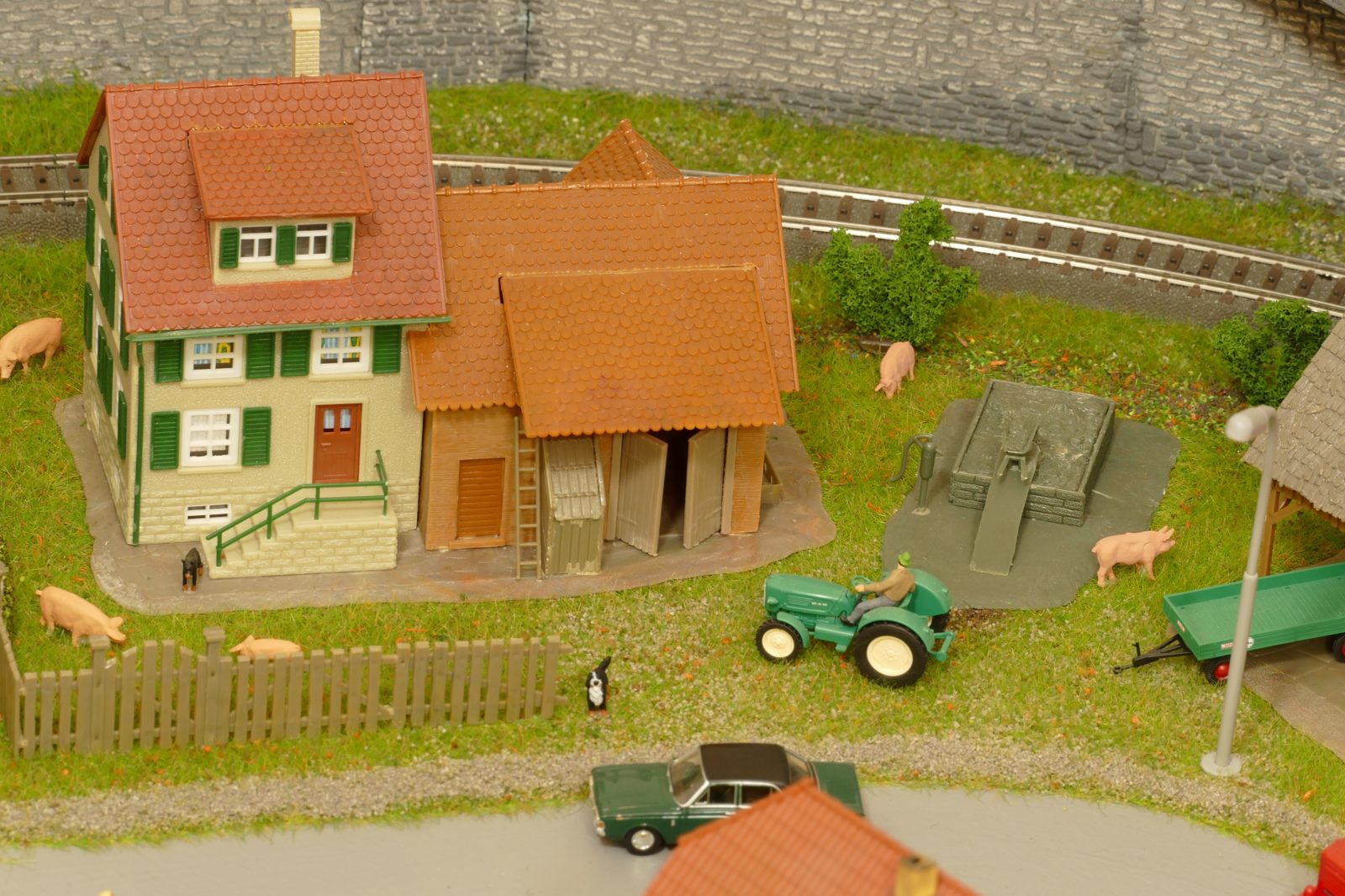 Glückliche Schweine im Freilauf. Zwei Hunde passen auf, dass sie nicht das Grundstück verlassen. Der Ford 20m-Fahrer staunt nicht schlecht, weil der Zaun Lücken aufweist.