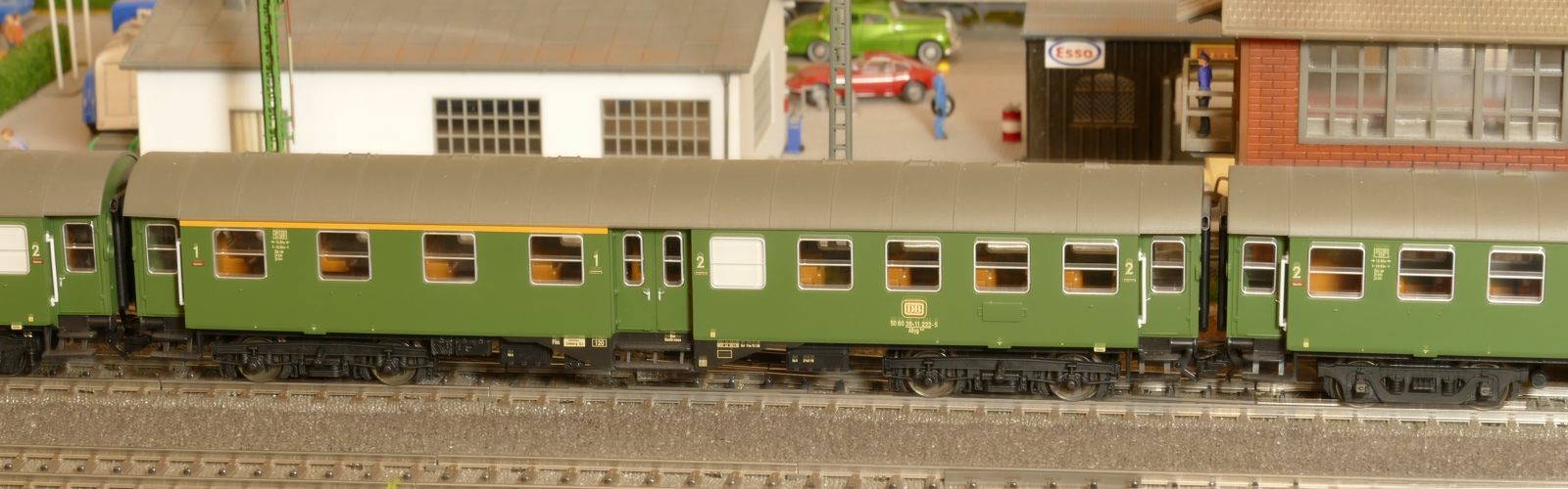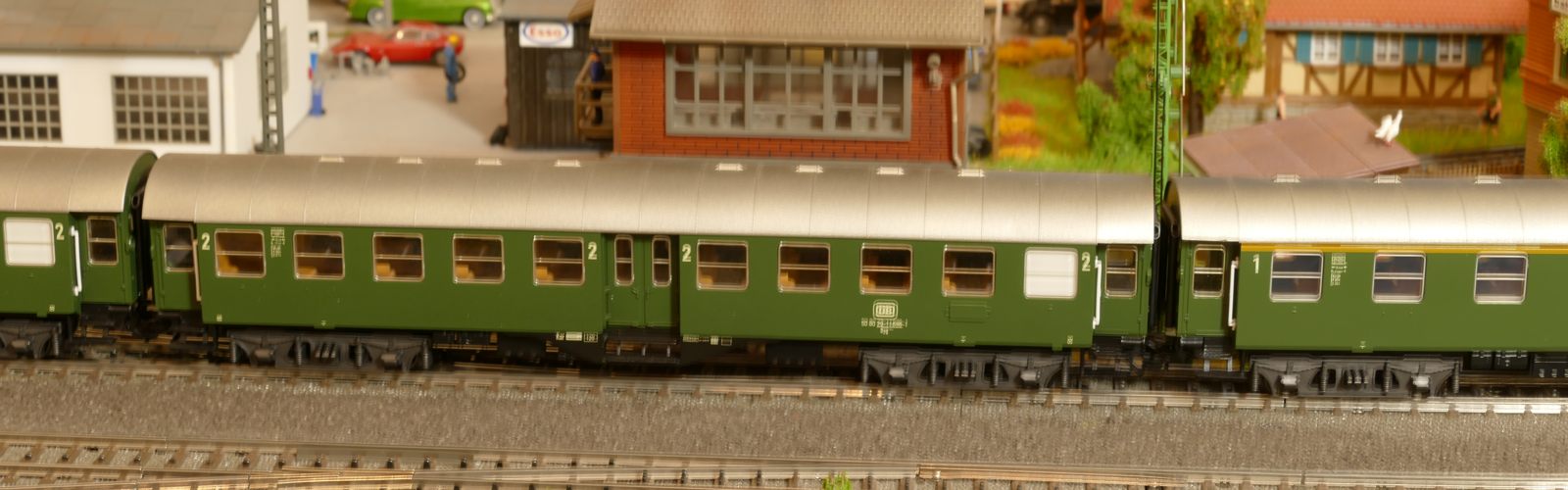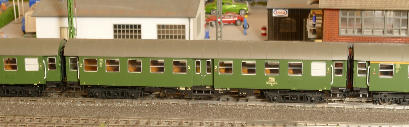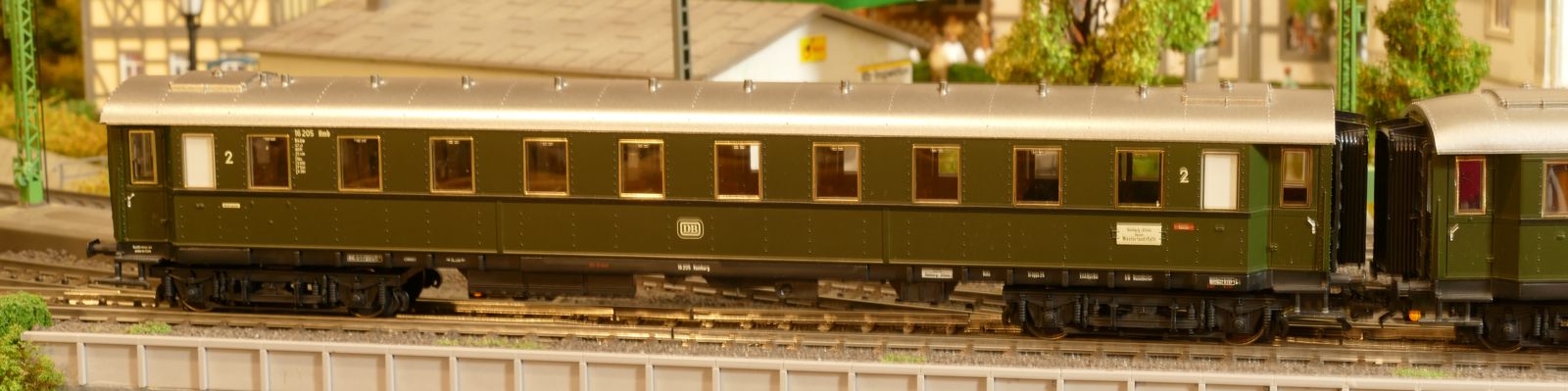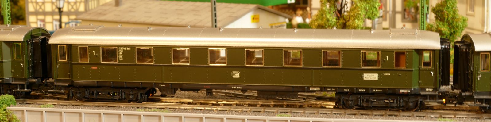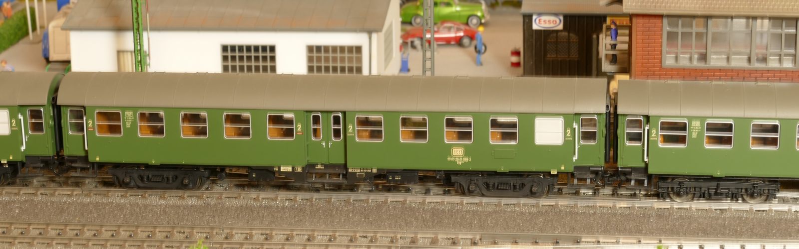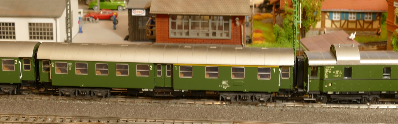 In den Nachkriegsjahren war die Personenbeförderung auf den Lang- oder Fernstrecken eine Sache der Schnellzüge, Eilzüge oder D-Züge. Wobei meines Wissens die Begriffe D-Zug und Schnellzug das Gleiche meinen. Verbindungen zwischen großen Städten wurden von diesen Zugtypen angeboten. In der Regel kann man davon ausgehen, dass die Eilzüge es weniger eilig hatten als die Schnellzüge, weil sie deutlich mehr Unterwegshalte zu bedienen hatten. Beispielsweise hatte der „Heckeneilzug“ E451/452 Bremen/Frankfurt, dem ich ja unter dem Menüpunkt Eisenbahn ein Extra-Kapitel gewidmet habe, da er auch Büren anlief, 22 Unterwegshalte zwischen den beiden Großstädten. So ist die Durchschnittsgeschwindigkeit von 40km/h (1949), 44km/h (1959) und 55km/h (1973) besser einzuordnen. Ich fahre ihn autentisch (1960er) mit 6 Wagen, darunter 4 Silberlinge. Einer weiterer Heckeneilzug des Jahres 1974 war der E1642. Dieser Zug fuhr von Braunschweig nach Aachen und nahm dabei den Laufweg über die Städte Kreiensen – Holzminden – Wehrden (Weser) – Beverungen – Scherfede – Brilon Wald (mein Brilion-Wald auf der Modellbahn) – Schwerte – Hagen – Wuppertal – Köln nach Aachen. Der E1642 war mit einer BR216 bespannt und zog 4 Vierachser: Gepäckwagen grün, 1./2. Klasse Wagen grün, zwei 2. Klasse Wagen, grün. Andere Beispiele sind der E633/634 zwischen Altenbeken und Hamburg oder der E347/348 zwischen Aachen und Hagen. Schnellzüge in dieser Zeit waren da schon deutlich flotter unterwegs, da sie ja auch meist auf den Eisenbahn-Magistralen mit wenig Kurven fuhren und weniger Zwischenhalte zu bedienen hatten. 80 bis 100km/h Durchschnittsgeschwindigkeit wurden damals schon von den schnellsten Zügen erreicht, wobei meistens mit max. 120km/h gefahren werden durfte. Verbindungen wie Stuttgart – Hamburg, Köln – Kiel, Bonn – Hannover, Innsbruck – Dortmund oder gar München – Kiel (1200km in ca. 14 Stunden) stehen für diese Art von Zügen. Na ja, das Reisen damals war doch sehr unterschiedlich zu heute. Zugfenster, die zu öffnen sind, niedrige Bahnsteige, Schwerstarbeit für das Besteigen mit großen Koffern in die hohen Wagen durch schmale Türen, Dampf und Russ allerorten, Bahnsteigkontrollen, Pünktlichkeit. Wenn man selbst unpünktlich war, konnte man sogar dem anfahrenden Zuf nachrennen und auf die Stufen springen, da die Tür natürlich von außen noch zu öffnen war. Ich kenne das aus eigener Erfahrung. Um nur ein paar Fakten in der Zeit der guten alten Bundesbahn zu nennen.