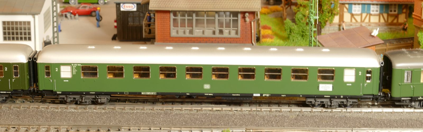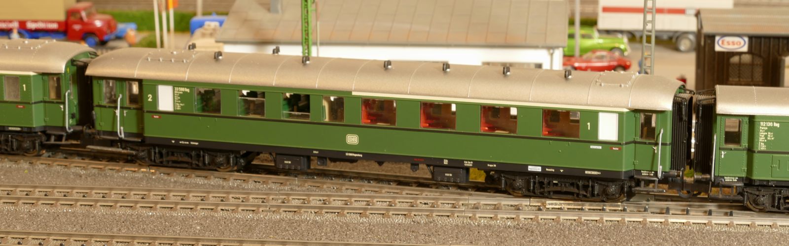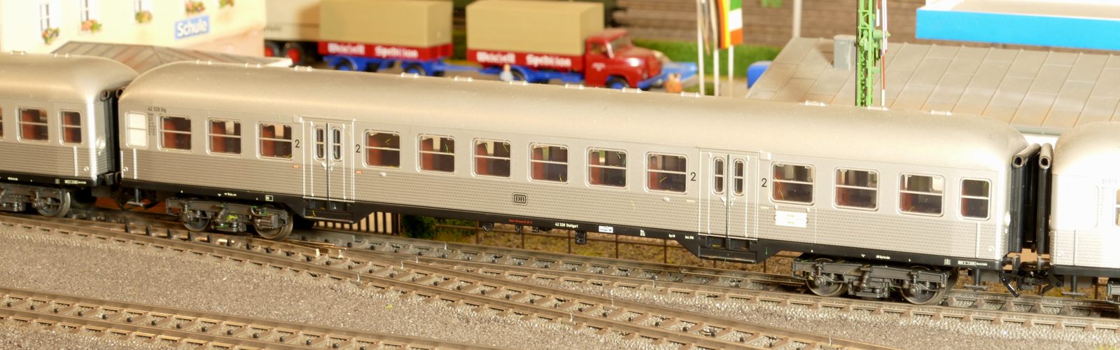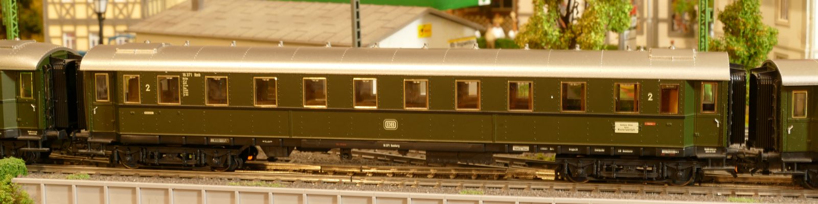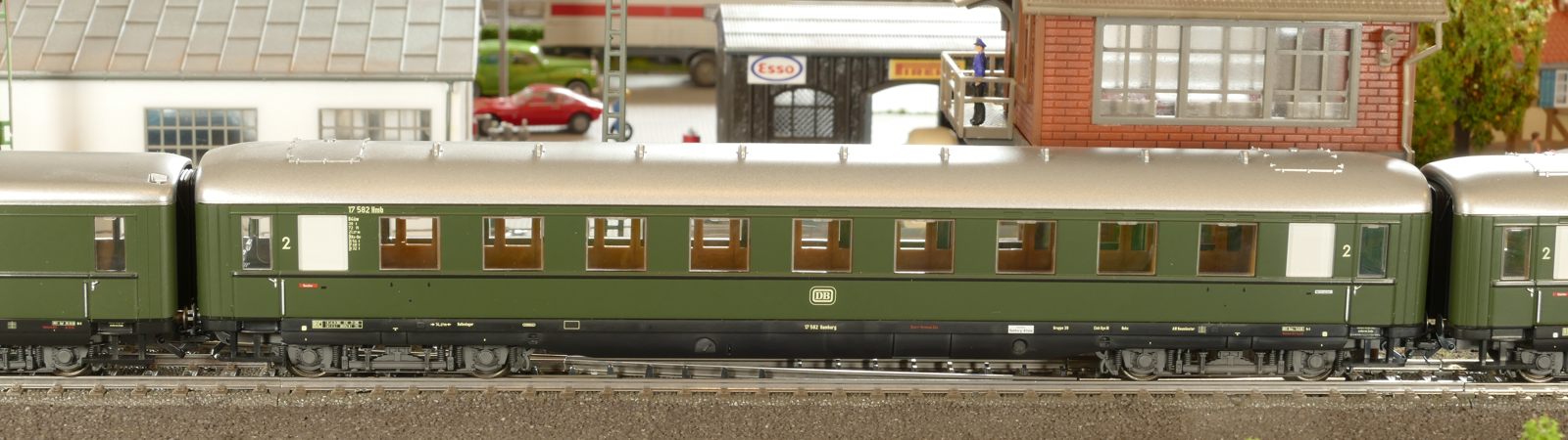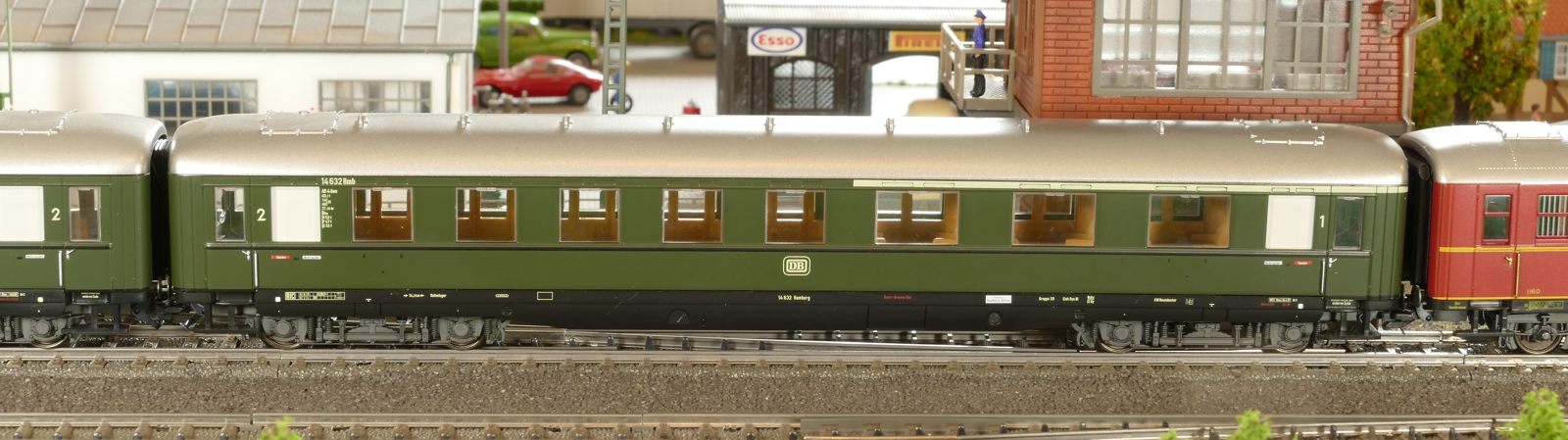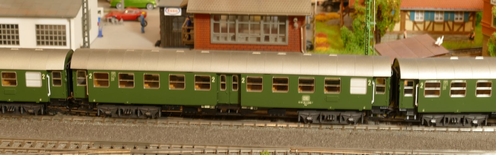In den Nachkriegsjahren war die Personenbeförderung auf den Lang- oder Fernstrecken eine Sache der Schnellzüge, Eilzüge oder D-Züge. Wobei meines Wissens die Begriffe D-Zug und Schnellzug das Gleiche meinen. Verbindungen zwischen großen Städten wurden von diesen Zugtypen angeboten. In der Regel kann man davon ausgehen, dass die Eilzüge es weniger eilig hatten als die Schnellzüge, weil sie deutlich mehr Unterwegshalte zu bedienen hatten. Beispielsweise hatte der „Heckeneilzug“ E451/452 Bremen/Frankfurt, dem ich ja unter dem Menüpunkt Eisenbahn ein Extra-Kapitel gewidmet habe, da er auch Büren anlief, 22 Unterwegshalte zwischen den beiden Großstädten. So ist die Durchschnittsgeschwindigkeit von 40km/h (1949), 44km/h (1959) und 55km/h (1973) besser einzuordnen. Ich fahre ihn autentisch (1960er) mit 6 Wagen, darunter 4 Silberlinge. Einer weiterer Heckeneilzug des Jahres 1974 war der E1642. Dieser Zug fuhr von Braunschweig nach Aachen und nahm dabei den Laufweg über die Städte Kreiensen – Holzminden – Wehrden (Weser) – Beverungen – Scherfede – Brilon Wald (mein Brilion-Wald auf der Modellbahn) – Schwerte – Hagen – Wuppertal – Köln nach Aachen. Der E1642 war mit einer BR216 bespannt und zog 4 Vierachser: Gepäckwagen grün, 1./2. Klasse Wagen grün, zwei 2. Klasse Wagen, grün. Andere Beispiele sind der E633/634 zwischen Altenbeken und Hamburg oder der E347/348 zwischen Aachen und Hagen. Schnellzüge in dieser Zeit waren da schon deutlich flotter unterwegs, da sie ja auch meist auf den Eisenbahn-Magistralen mit wenig Kurven fuhren und weniger Zwischenhalte zu bedienen hatten. 80 bis 100km/h Durchschnittsgeschwindigkeit wurden damals schon von den schnellsten Zügen erreicht, wobei meistens mit max. 120km/h gefahren werden durfte. Verbindungen wie Stuttgart – Hamburg, Köln – Kiel, Bonn – Hannover, Innsbruck – Dortmund oder gar München – Kiel (1200km in ca. 14 Stunden) stehen für diese Art von Zügen. Na ja, das Reisen damals war doch sehr unterschiedlich zu heute. Zugfenster, die zu öffnen sind, niedrige Bahnsteige, Schwerstarbeit für das Besteigen mit großen Koffern in die hohen Wagen durch schmale Türen, Dampf und Russ allerorten, Bahnsteigkontrollen, Pünktlichkeit. Wenn man selbst unpünktlich war, konnte man sogar dem anfahrenden Zuf nachrennen und auf die Stufen springen, da die Tür natürlich von außen noch zu öffnen war. Ich kenne das aus eigener Erfahrung. Um nur ein paar Fakten in der Zeit der guten alten Bundesbahn zu nennen.