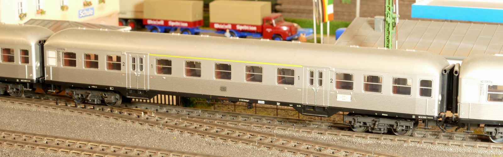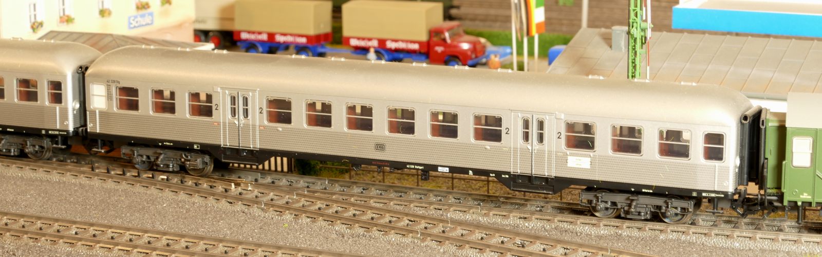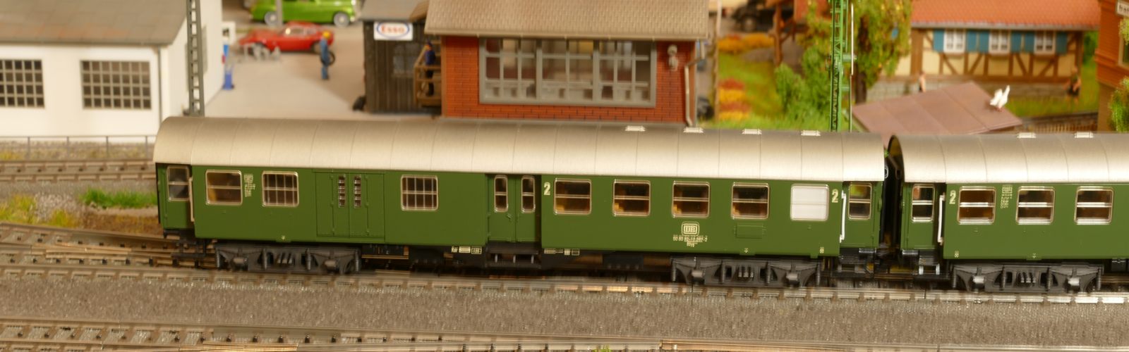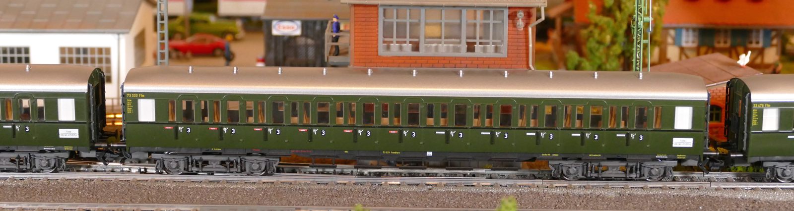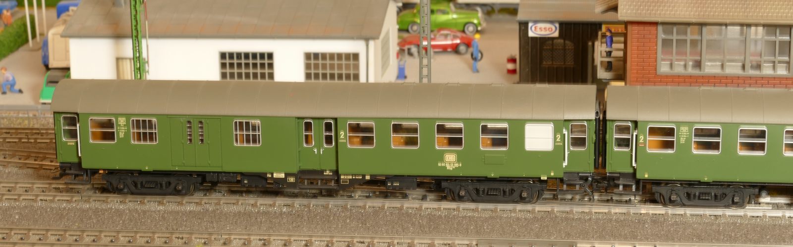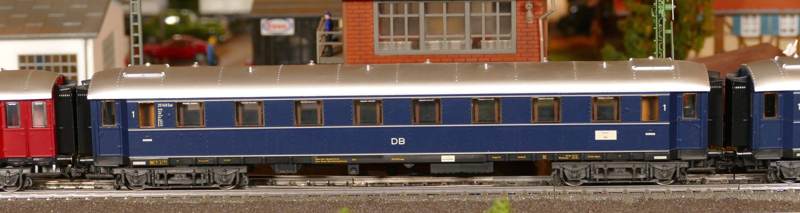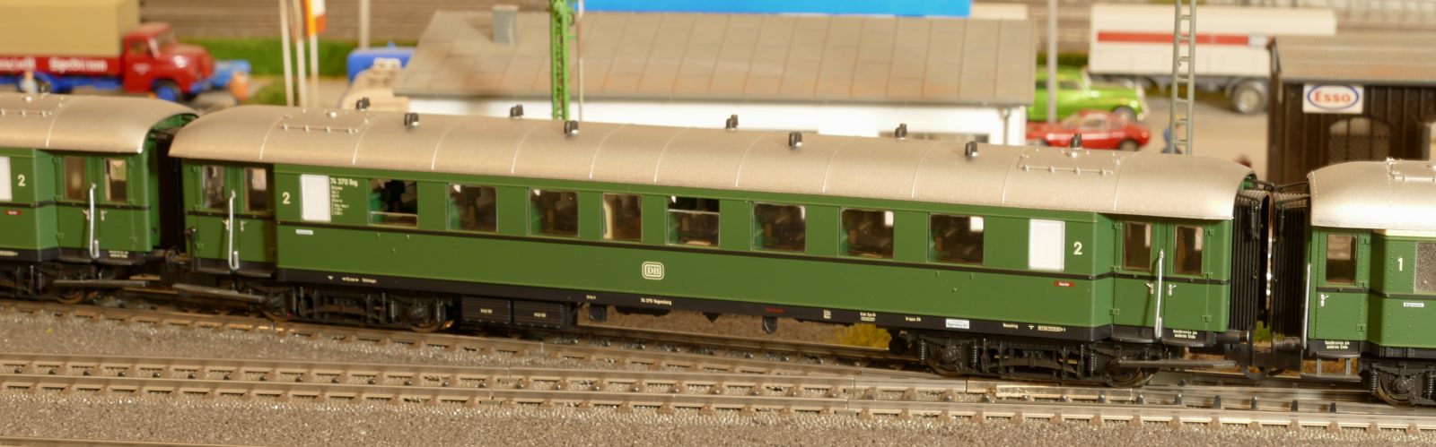 In den Nachkriegsjahren war die Personenbeförderung auf den Lang- oder Fernstrecken eine Sache der Schnellzüge, Eilzüge oder D-Züge. Wobei meines Wissens die Begriffe D-Zug und Schnellzug das Gleiche meinen. Verbindungen zwischen großen Städten wurden von diesen Zugtypen angeboten. In der Regel kann man davon ausgehen, dass die Eilzüge es weniger eilig hatten als die Schnellzüge, weil sie deutlich mehr Unterwegshalte zu bedienen hatten. Beispielsweise hatte der „Heckeneilzug“ E451/452 Bremen/Frankfurt, dem ich ja unter dem Menüpunkt Eisenbahn ein Extra-Kapitel gewidmet habe, da er auch Büren anlief, 22 Unterwegshalte zwischen den beiden Großstädten. So ist die Durchschnittsgeschwindigkeit von 40km/h (1949), 44km/h (1959) und 55km/h (1973) besser einzuordnen. Ich fahre ihn autentisch (1960er) mit 6 Wagen, darunter 4 Silberlinge. Einer weiterer Heckeneilzug des Jahres 1974 war der E1642. Dieser Zug fuhr von Braunschweig nach Aachen und nahm dabei den Laufweg über die Städte Kreiensen – Holzminden – Wehrden (Weser) – Beverungen – Scherfede – Brilon Wald (mein Brilion-Wald auf der Modellbahn) – Schwerte – Hagen – Wuppertal – Köln nach Aachen. Der E1642 war mit einer BR216 bespannt und zog 4 Vierachser: Gepäckwagen grün, 1./2. Klasse Wagen grün, zwei 2. Klasse Wagen, grün. Andere Beispiele sind der E633/634 zwischen Altenbeken und Hamburg oder der E347/348 zwischen Aachen und Hagen. Schnellzüge in dieser Zeit waren da schon deutlich flotter unterwegs, da sie ja auch meist auf den Eisenbahn-Magistralen mit wenig Kurven fuhren und weniger Zwischenhalte zu bedienen hatten. 80 bis 100km/h Durchschnittsgeschwindigkeit wurden damals schon von den schnellsten Zügen erreicht, wobei meistens mit max. 120km/h gefahren werden durfte. Verbindungen wie Stuttgart – Hamburg, Köln – Kiel, Bonn – Hannover, Innsbruck – Dortmund oder gar München – Kiel (1200km in ca. 14 Stunden) stehen für diese Art von Zügen. Na ja, das Reisen damals war doch sehr unterschiedlich zu heute. Zugfenster, die zu öffnen sind, niedrige Bahnsteige, Schwerstarbeit für das Besteigen mit großen Koffern in die hohen Wagen durch schmale Türen, Dampf und Russ allerorten, Bahnsteigkontrollen, Pünktlichkeit. Wenn man selbst unpünktlich war, konnte man sogar dem anfahrenden Zuf nachrennen und auf die Stufen springen, da die Tür natürlich von außen noch zu öffnen war. Ich kenne das aus eigener Erfahrung. Um nur ein paar Fakten in der Zeit der guten alten Bundesbahn zu nennen.