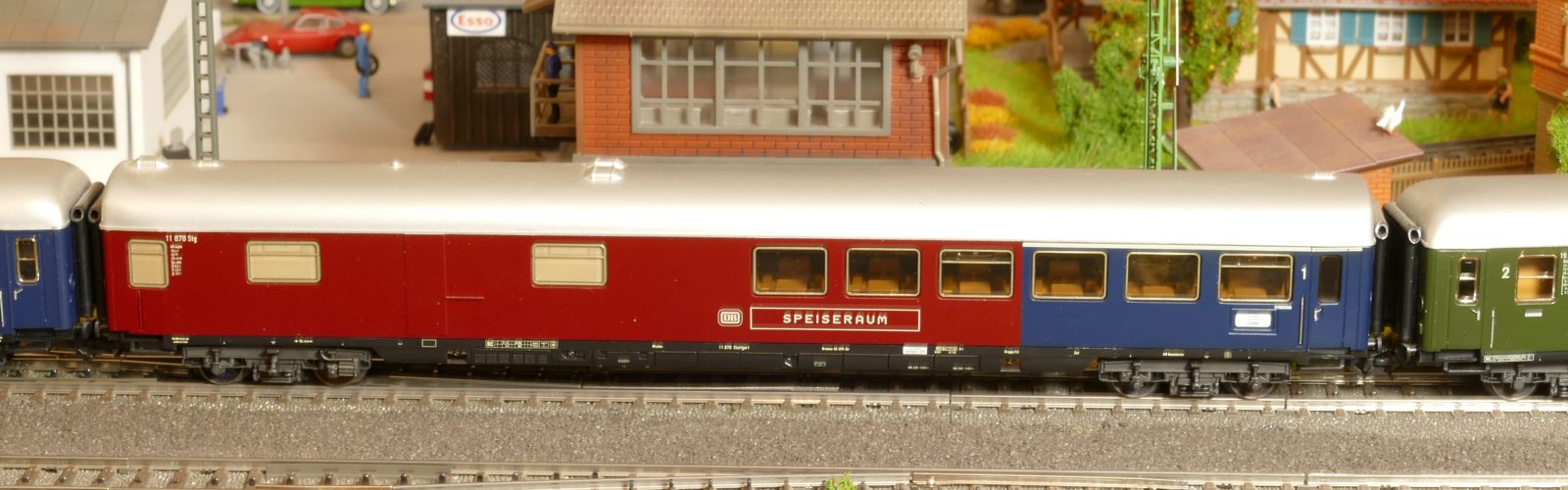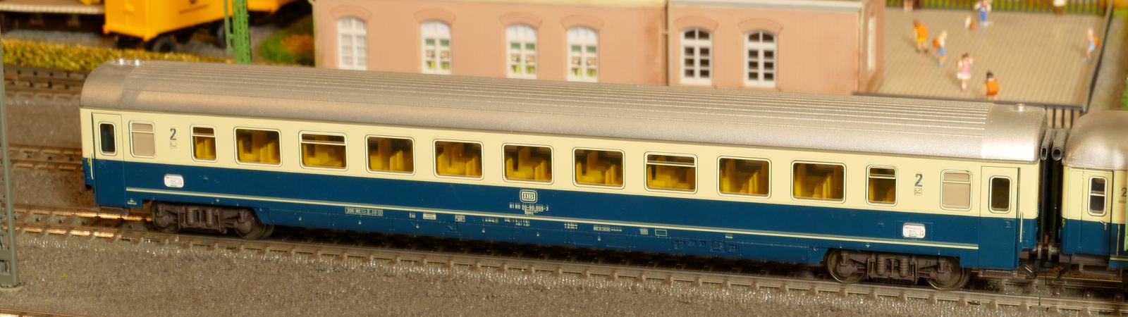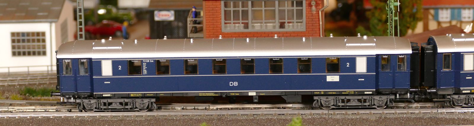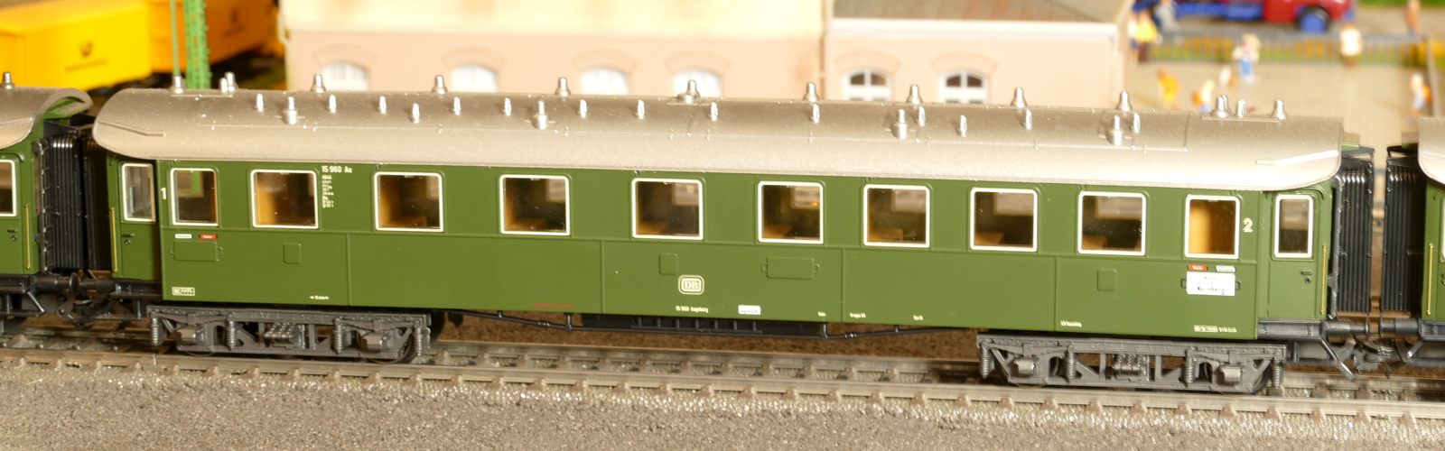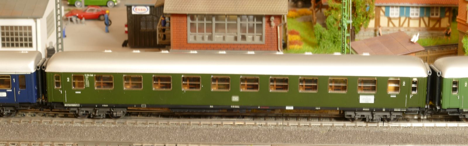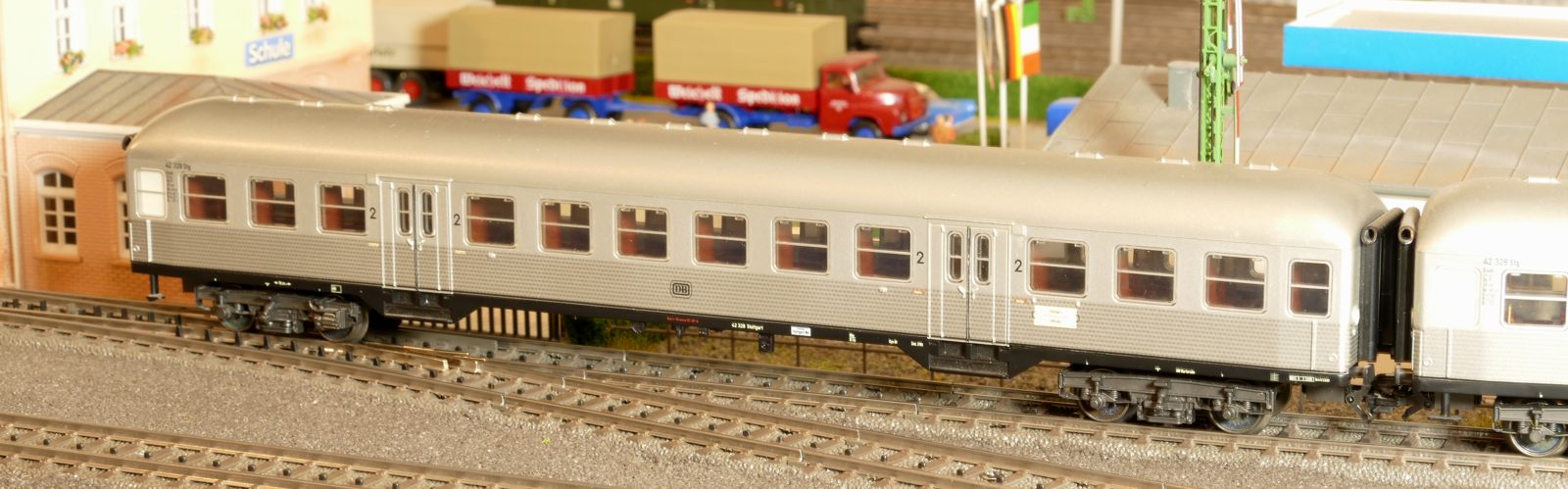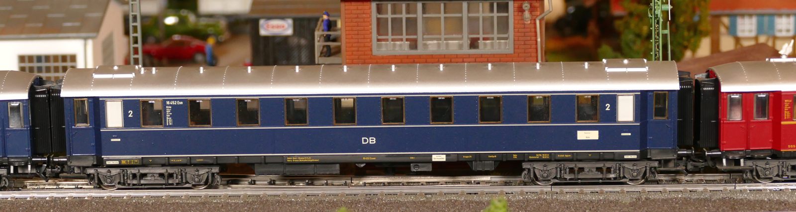In den Nachkriegsjahren war die Personenbeförderung auf den Lang- oder Fernstrecken eine Sache der Schnellzüge, Eilzüge oder D-Züge. Wobei meines Wissens die Begriffe D-Zug und Schnellzug das Gleiche meinen. Verbindungen zwischen großen Städten wurden von diesen Zugtypen angeboten. In der Regel kann man davon ausgehen, dass die Eilzüge es weniger eilig hatten als die Schnellzüge, weil sie deutlich mehr Unterwegshalte zu bedienen hatten. Beispielsweise hatte der „Heckeneilzug“ E451/452 Bremen/Frankfurt, dem ich ja unter dem Menüpunkt Eisenbahn ein Extra-Kapitel gewidmet habe, da er auch Büren anlief, 22 Unterwegshalte zwischen den beiden Großstädten. So ist die Durchschnittsgeschwindigkeit von 40km/h (1949), 44km/h (1959) und 55km/h (1973) besser einzuordnen. Ich fahre ihn autentisch (1960er) mit 6 Wagen, darunter 4 Silberlinge. Einer weiterer Heckeneilzug des Jahres 1974 war der E1642. Dieser Zug fuhr von Braunschweig nach Aachen und nahm dabei den Laufweg über die Städte Kreiensen – Holzminden – Wehrden (Weser) – Beverungen – Scherfede – Brilon Wald (mein Brilion-Wald auf der Modellbahn) – Schwerte – Hagen – Wuppertal – Köln nach Aachen. Der E1642 war mit einer BR216 bespannt und zog 4 Vierachser: Gepäckwagen grün, 1./2. Klasse Wagen grün, zwei 2. Klasse Wagen, grün. Andere Beispiele sind der E633/634 zwischen Altenbeken und Hamburg oder der E347/348 zwischen Aachen und Hagen. Schnellzüge in dieser Zeit waren da schon deutlich flotter unterwegs, da sie ja auch meist auf den Eisenbahn-Magistralen mit wenig Kurven fuhren und weniger Zwischenhalte zu bedienen hatten. 80 bis 100km/h Durchschnittsgeschwindigkeit wurden damals schon von den schnellsten Zügen erreicht, wobei meistens mit max. 120km/h gefahren werden durfte. Verbindungen wie Stuttgart – Hamburg, Köln – Kiel, Bonn – Hannover, Innsbruck – Dortmund oder gar München – Kiel (1200km in ca. 14 Stunden) stehen für diese Art von Zügen. Na ja, das Reisen damals war doch sehr unterschiedlich zu heute. Zugfenster, die zu öffnen sind, niedrige Bahnsteige, Schwerstarbeit für das Besteigen mit großen Koffern in die hohen Wagen durch schmale Türen, Dampf und Russ allerorten, Bahnsteigkontrollen, Pünktlichkeit. Wenn man selbst unpünktlich war, konnte man sogar dem anfahrenden Zuf nachrennen und auf die Stufen springen, da die Tür natürlich von außen noch zu öffnen war. Ich kenne das aus eigener Erfahrung. Um nur ein paar Fakten in der Zeit der guten alten Bundesbahn zu nennen.